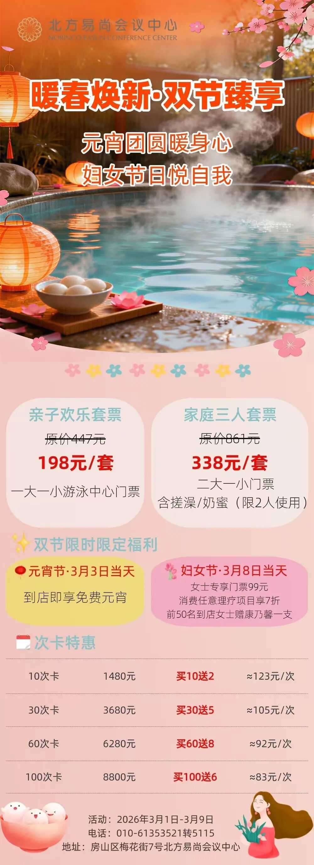 元宵团圆暖身心,北方易尚会议中心推出双节限定福利,让你在氤氲暖汤中卸下疲惫,享受惬意时光。活动期间,亲子欢乐套票198元/套,元宵节当天到店即享免费元宵,让暖汤陪伴你整个春天。