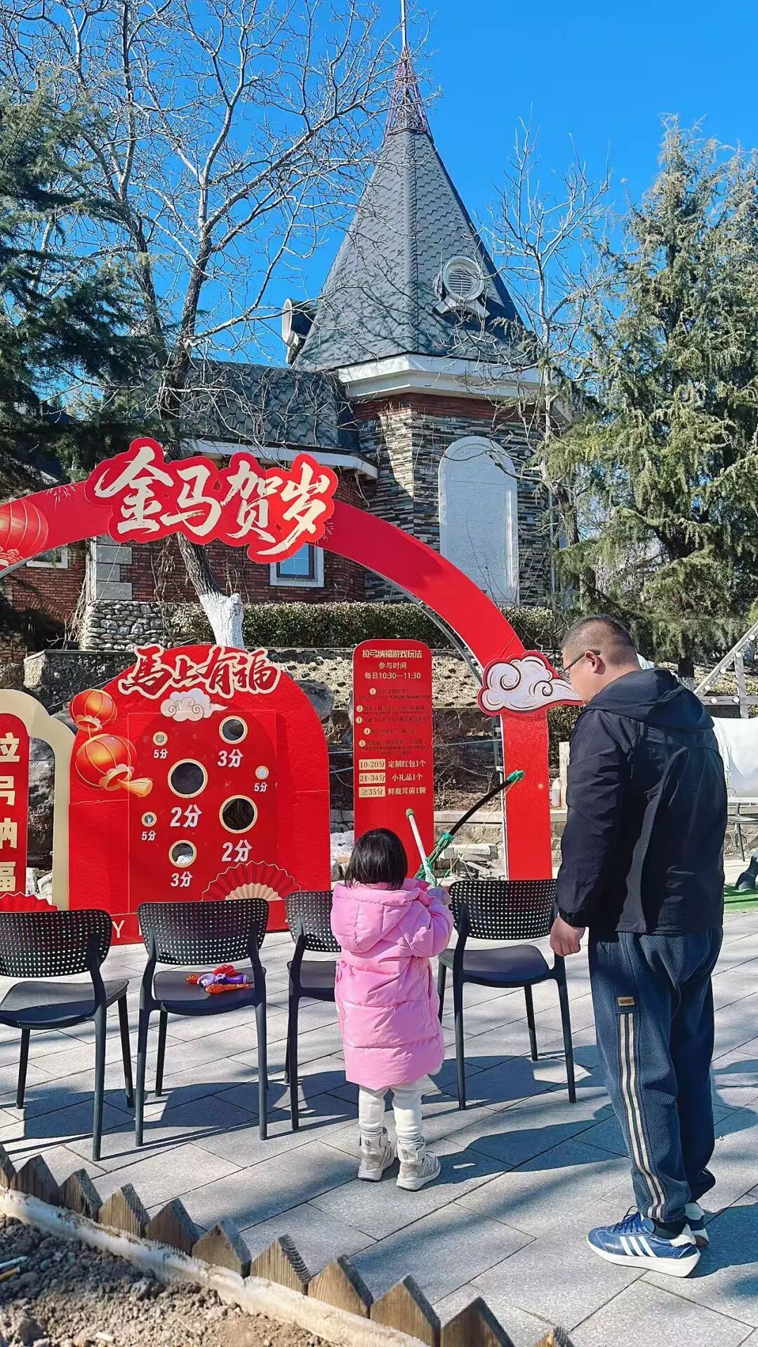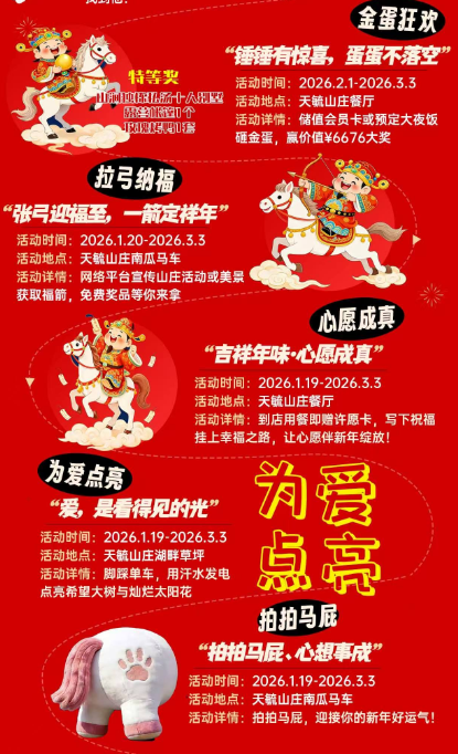 从腊月到元宵,天毓山庄年味玩法全面升级,五大限定活动轮番上线,承包你从腊月到元宵的所有快乐:在山庄餐厅消费参与“金蛋狂欢”砸金蛋;在南瓜马车旁参与网络宣传打卡,就能免费射箭赢好礼,“张弓迎福至,一箭定祥年”。