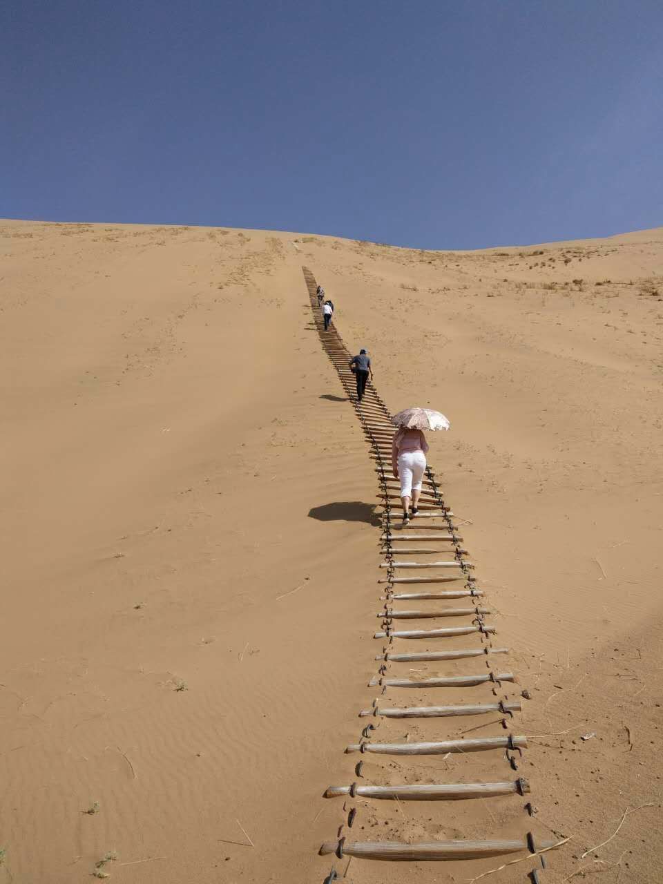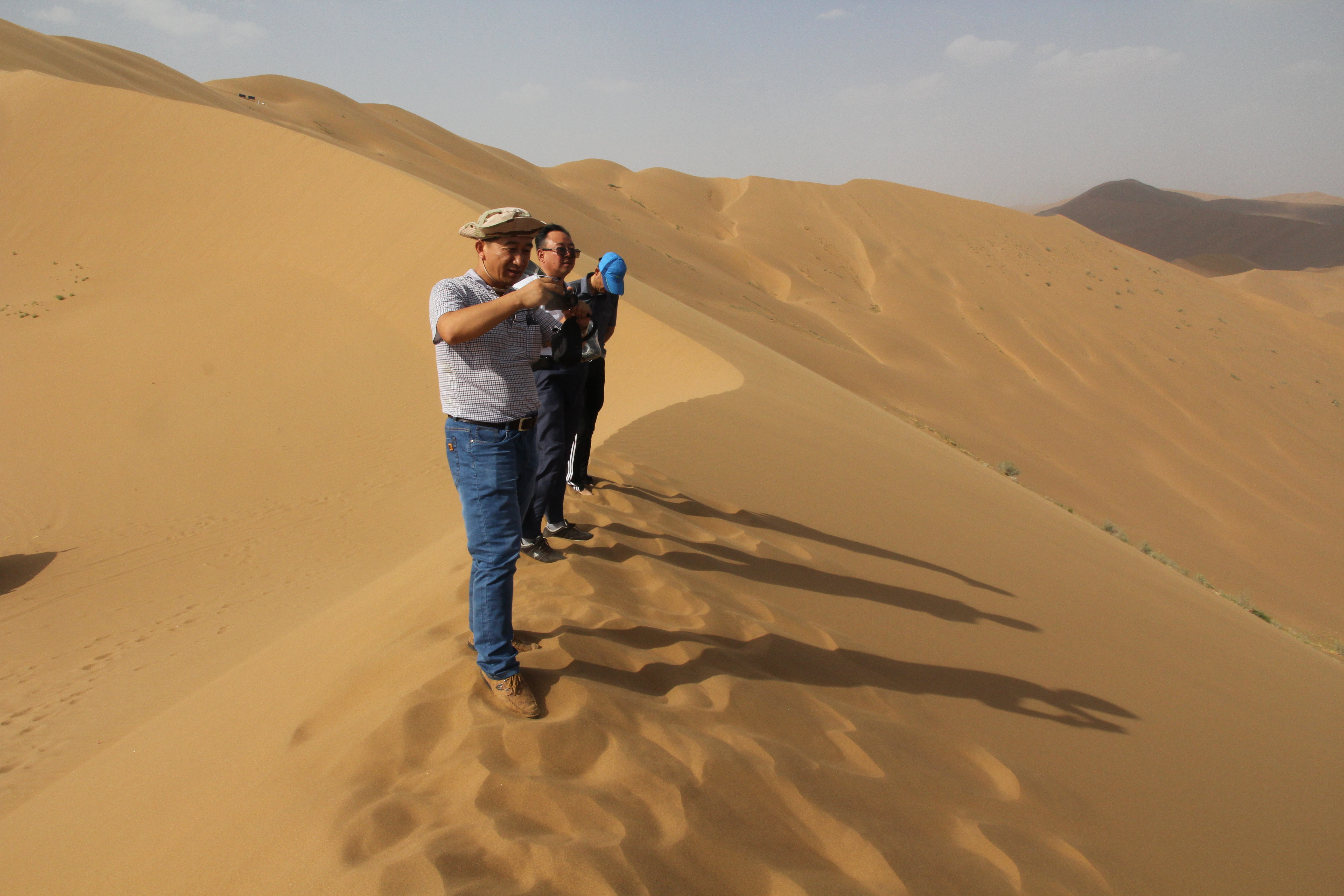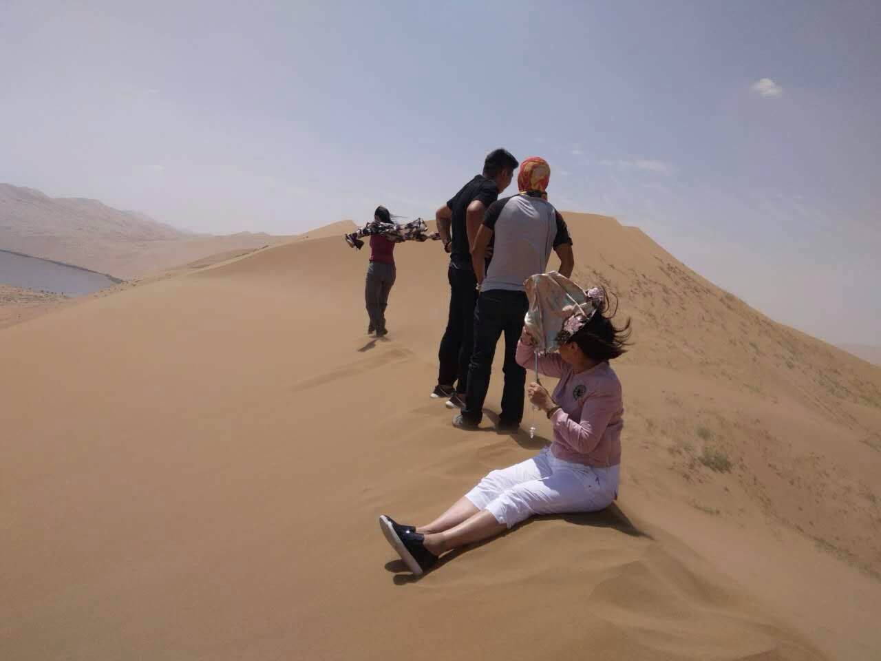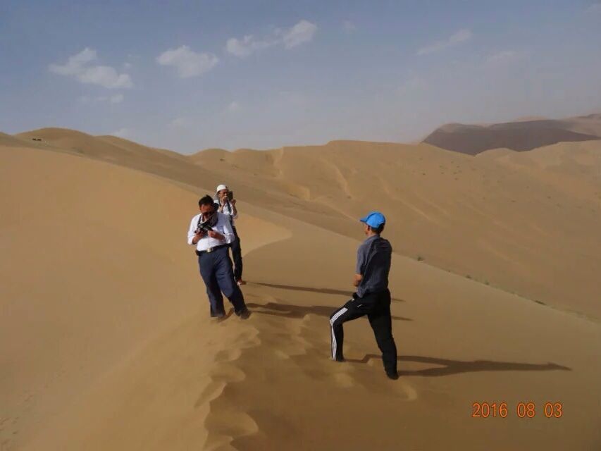 我们在巴丹湖附近选了一块滩地停车后,布和主席说,这里是我们爬沙山感受鸣沙山奇妙声音的地方。上山时有嵌入沙山上的木梯,我和郑玲玲冲在最前面,最先爬至山顶,炎炎烈日极为凶悍,毫不留情,沙山上地表温度最起码有五六十度。稍许,布和主席和承栋等人也爬了上来,我们一齐向山下滑落,瞬间,沙山上响起了如飞机般的轰鸣声,爬至半山的秦锦丽不相信这是我们滑山所产生的共鸣。布和主席说,沙山鸣响是因为众多沙粒运动时在气流中旋转,表面空洞造成一种空竹效应。