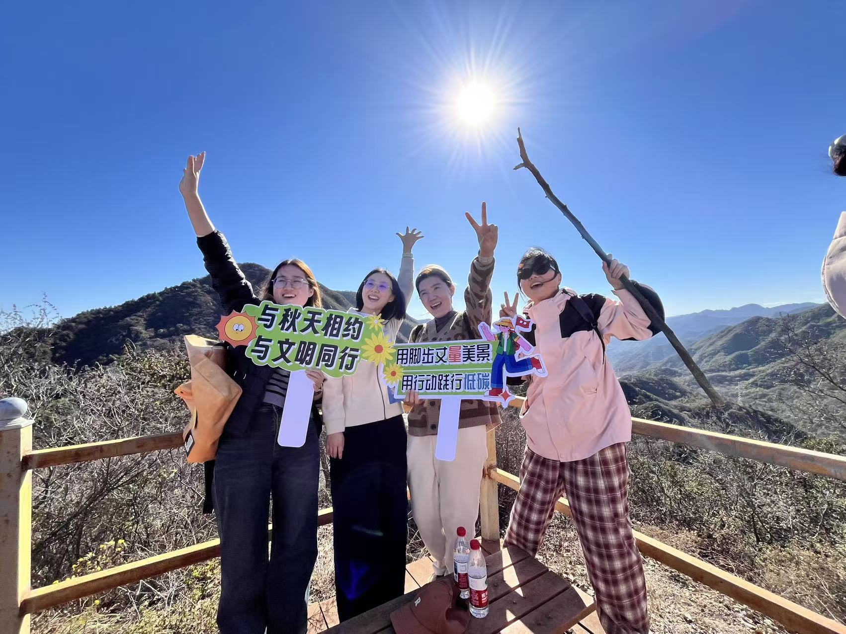 行进途中,大家主动弯腰捡拾栈道及周边垃圾,小心收纳后分类投入终点的空瓶回收桶,用实际行动守护山间美景、践行文明承诺。