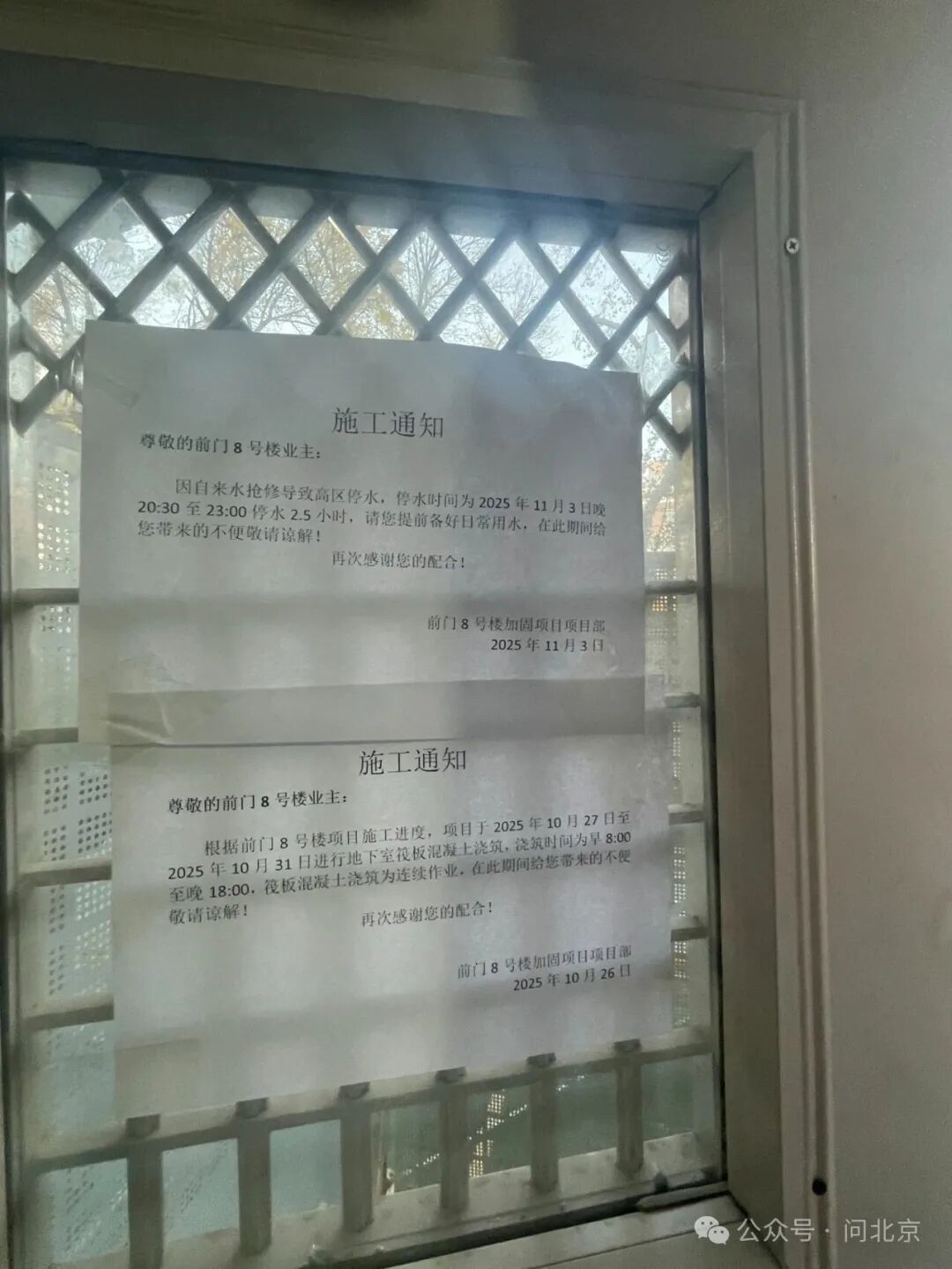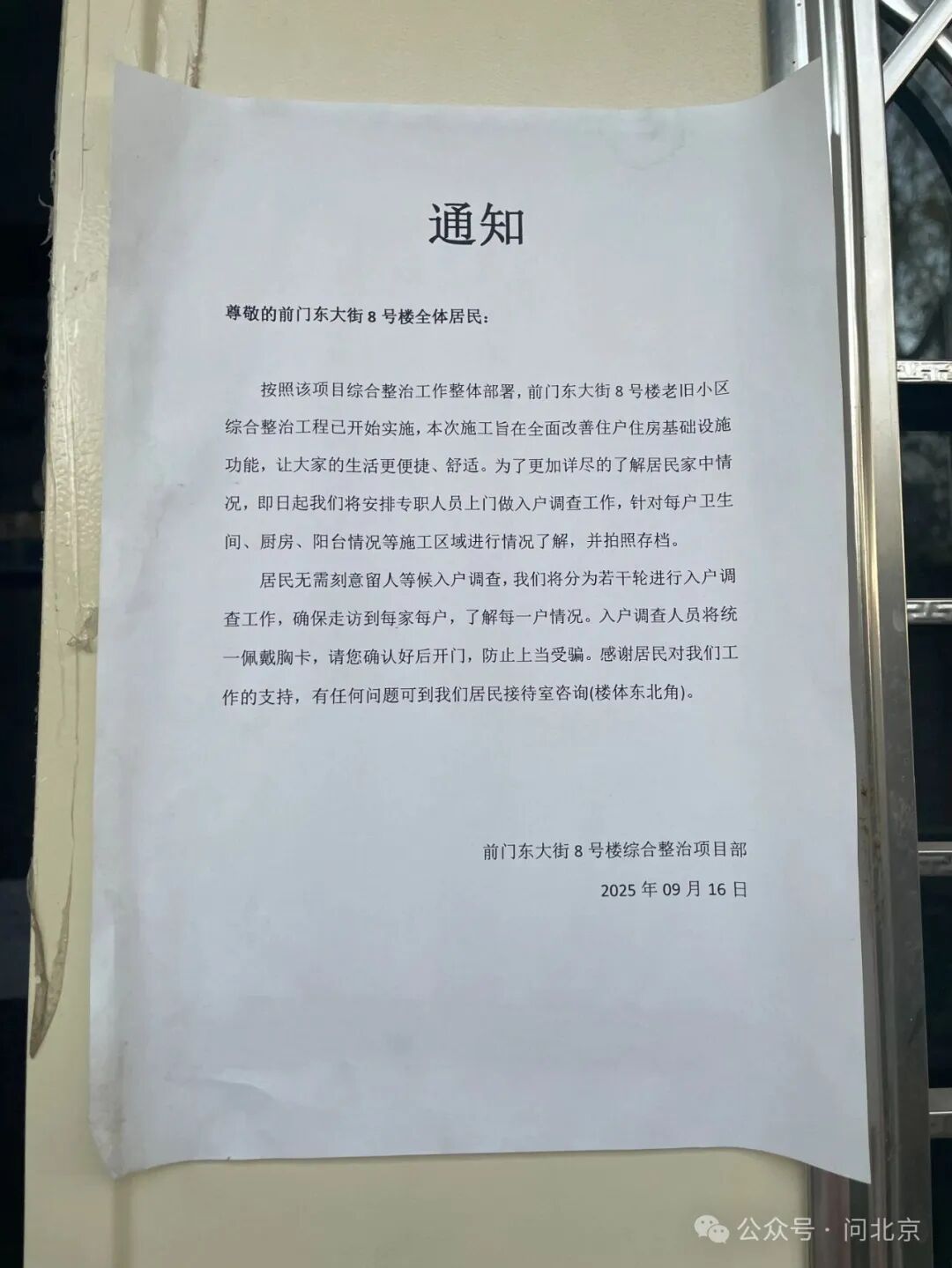 韩先生介绍说:“动工的第二天还是第三天,工程部就贴了一个通知,说先要挖开楼下的道路,应该是用于市政水一些改造,同时也是为了楼体的抗震加固做铺垫。过了两三天,前门街道组织大家去开了一个会,当时是把施工方、设计方,还有监理方,能涉及的这些单位都叫上了,跟居民们简单介绍了一下这个楼要怎么去改造。”