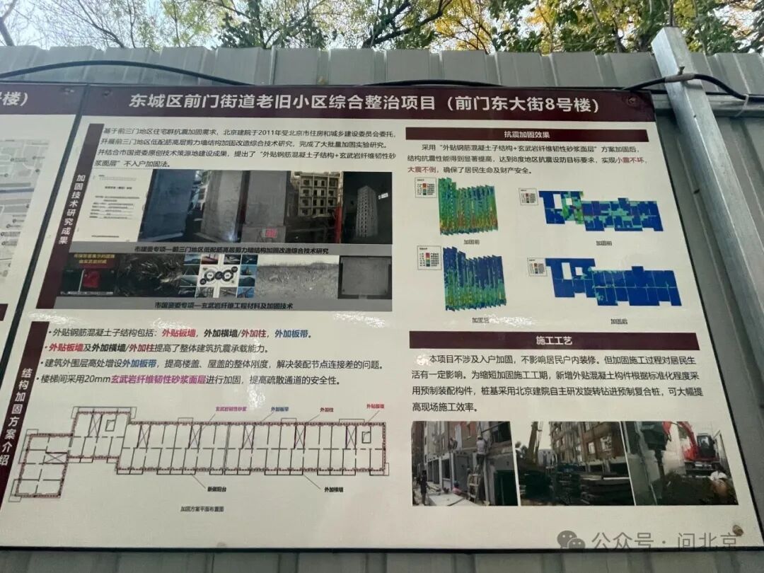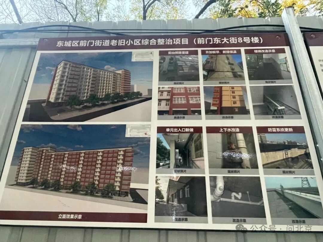 在单元楼门口,“问北京”记者看到了张贴的施工通知和旧改效果示意图,图中清晰标示了阳台改造、外保温层加装、单元门更新、上下水系统改造等居民关心的核心项目。