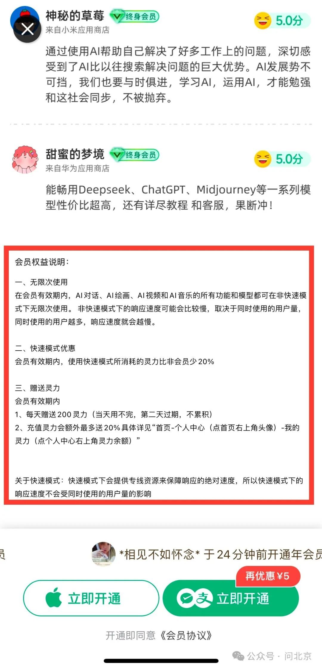 “问北京”记者不断向下滑动页面,在最底部一堆灰色小字中找到会员权益说明。仔细查看后发现,其中所提及的 “无限次使用”,是指在会员有效期内,AI 对话等四项功能及其所有模型,均可在非快速模式下无次数限制地使用。