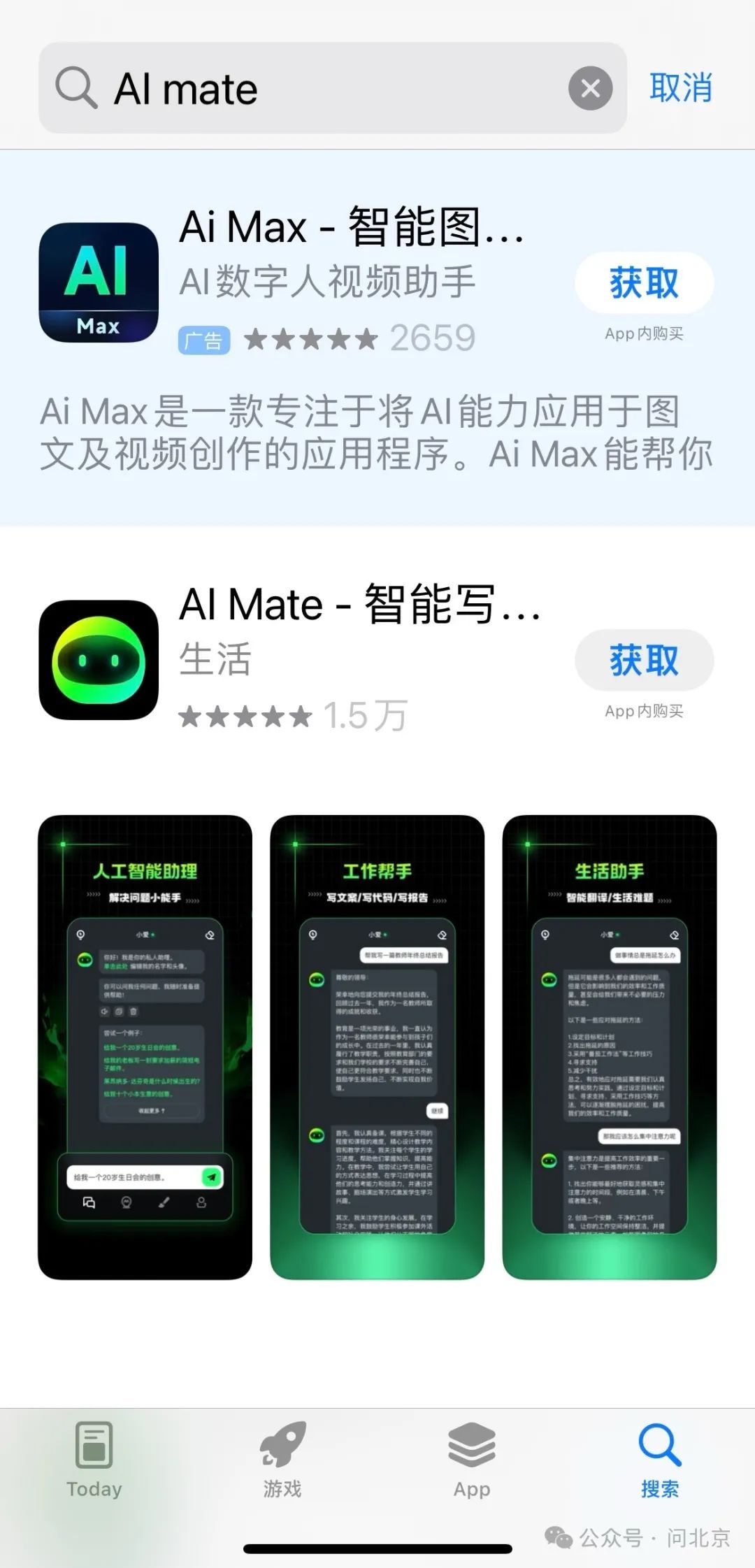 “问北京”记者在苹果商店里搜索AI mate 发现AI max出现在AI mate的上方,不过有蓝色小字标注着广告,评价中多位用户和赵先生一样提到软件体验感差。