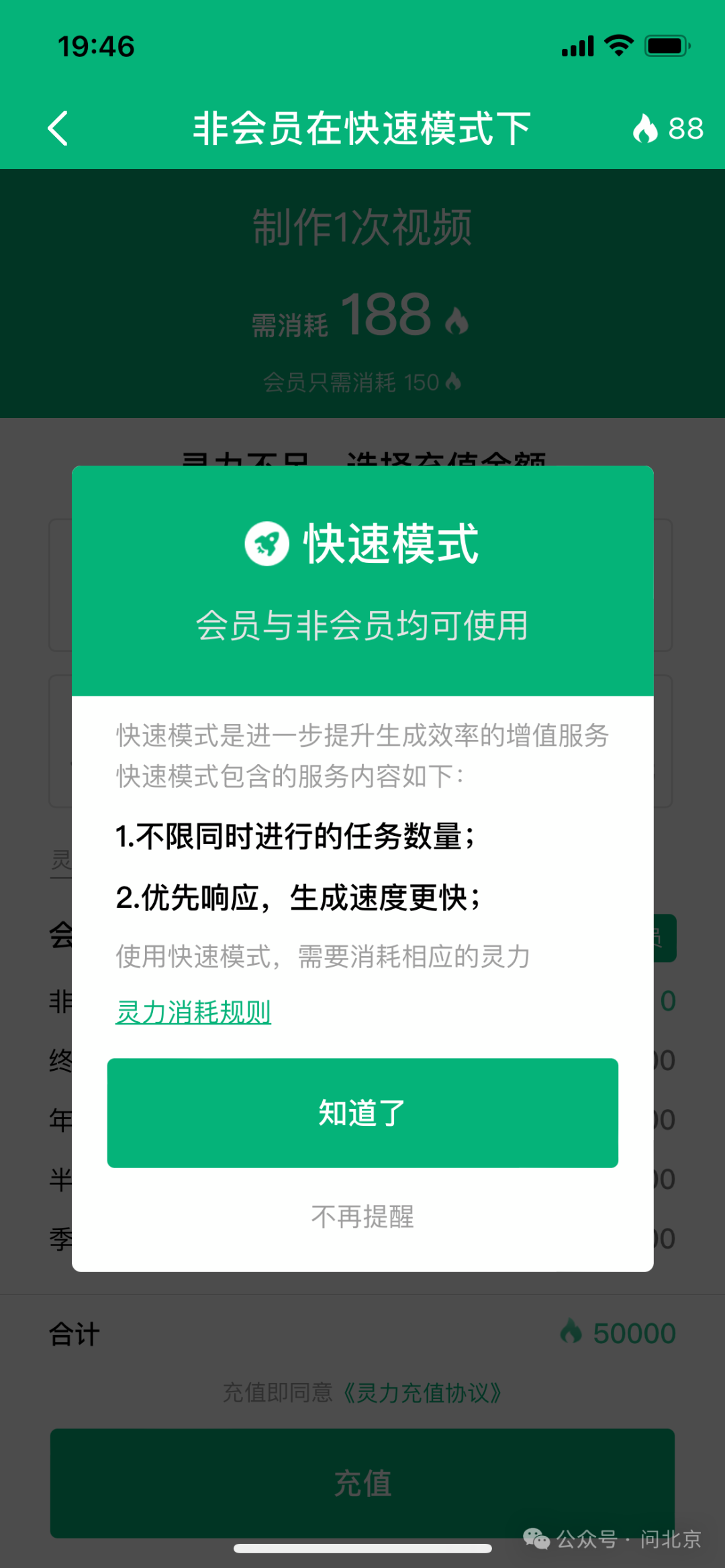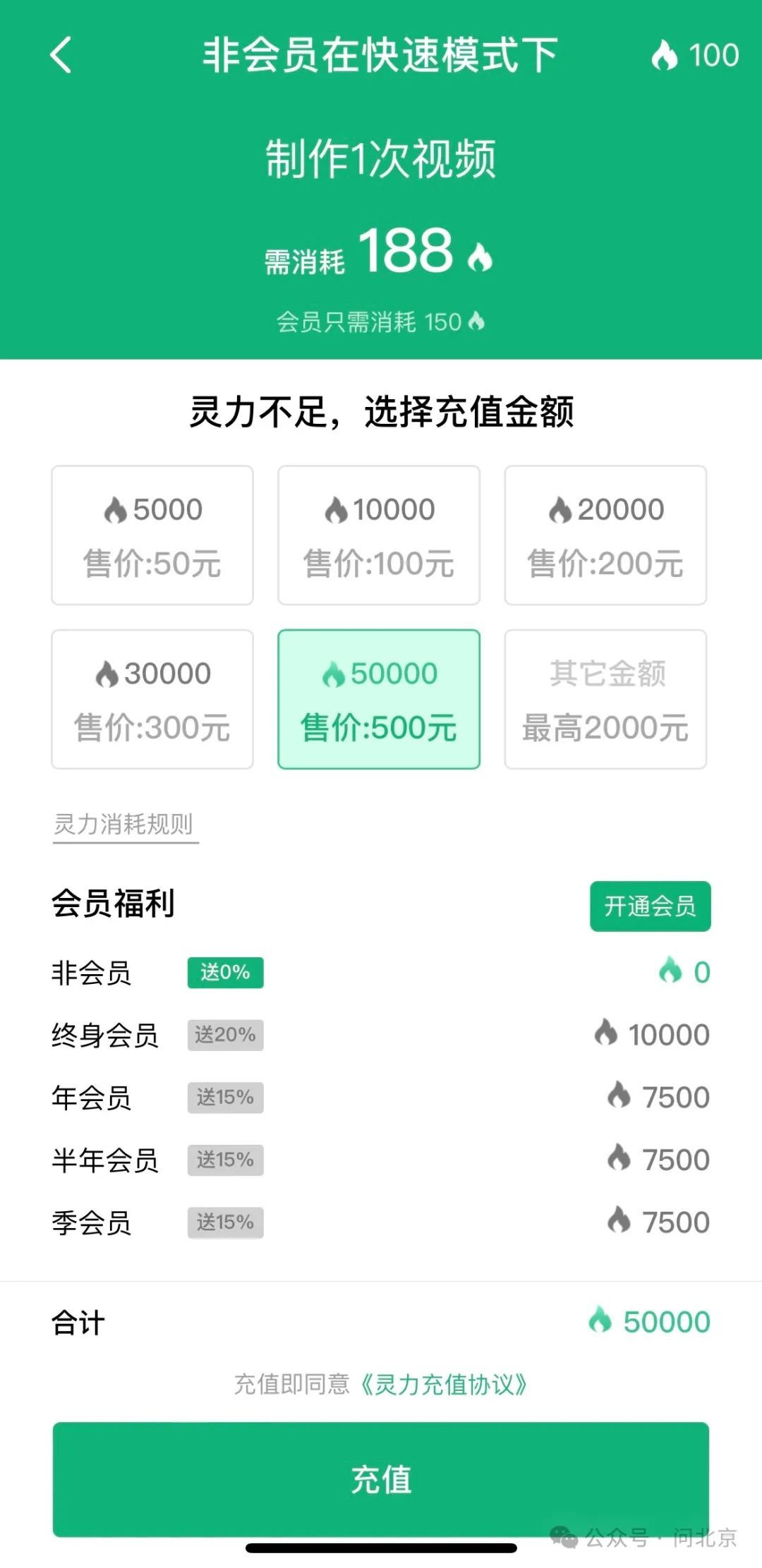 而无论是会员还是非会员,要想持续使用“快速模式”生成内容,都需要进行所谓的“灵力充值”。以5000灵力为例,售价为50元,虽然会员消耗灵力会比非会员享受一定折扣,但依然需要额外付费。