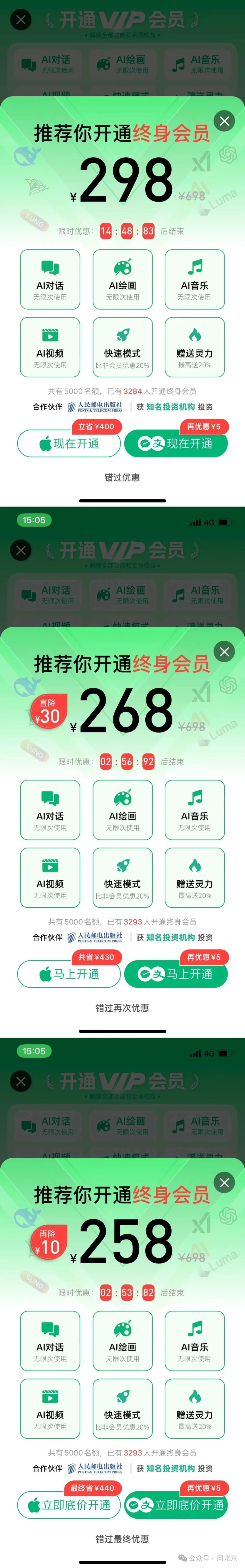 “问北京”记者下载了这一软件进行体验,打开后不断有弹窗推荐充值会员,多次点击退出之后终身会员的价格竟然从最初的298元一路“跳水”至268元,最终定格在258元。