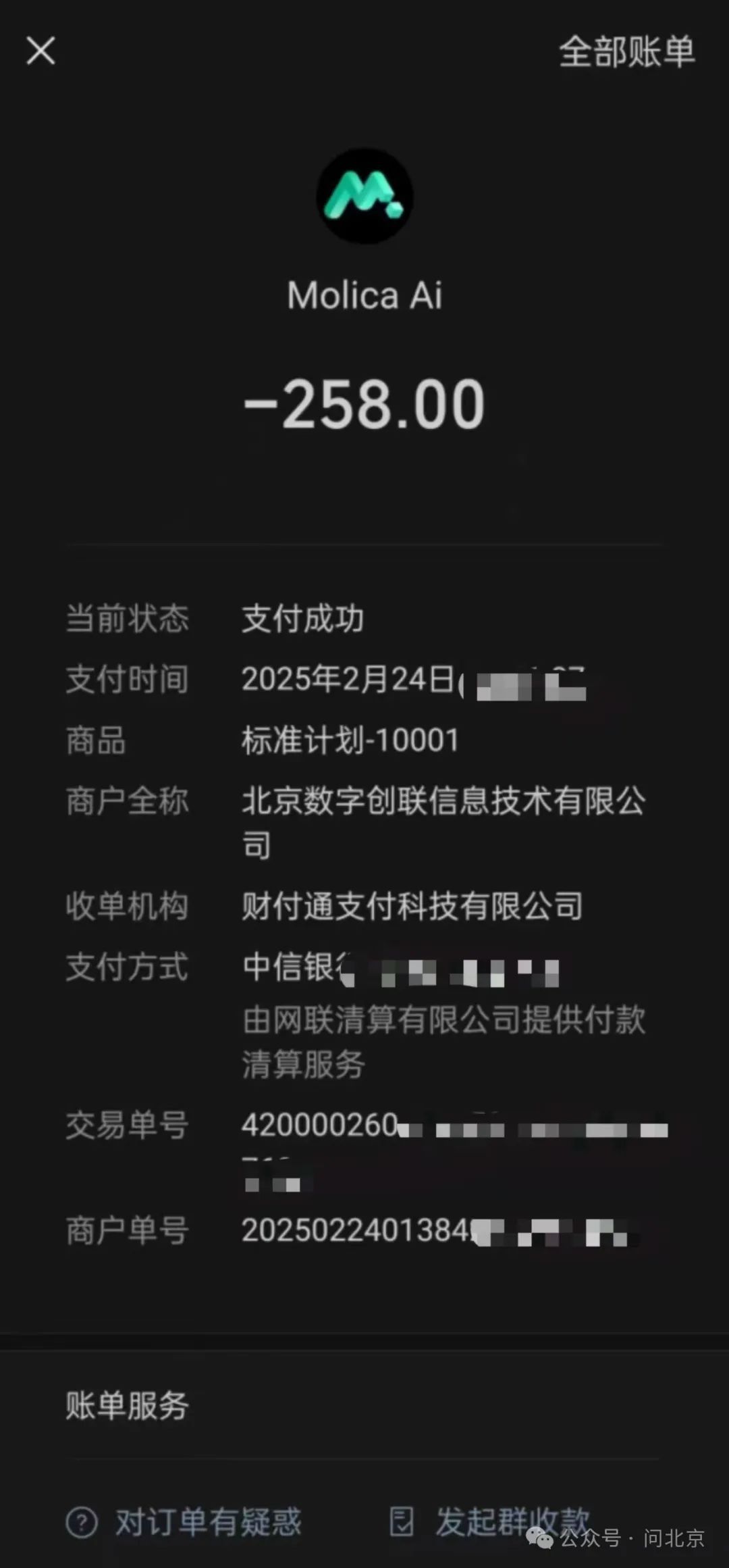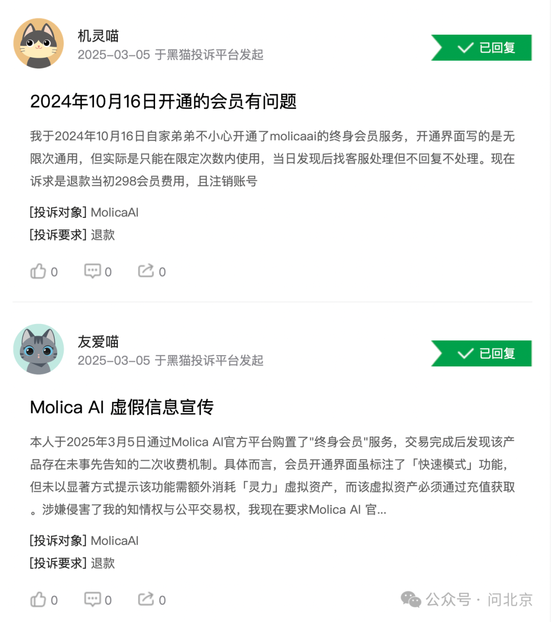 “问北京”记者查询到Molica AI软件的运营公司注册地位于北京市昌平区回龙观镇。随后,“问北京”记者以消费者名义辗转联系到了该公司所属的 史各庄市场监督管理所,工作人员介绍说近期确实接到了消费者对这家公司的投诉并要求退款,不过能否退款成功还要看用户的使用情况。