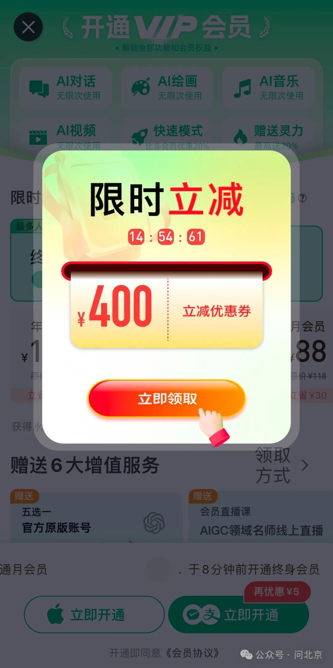 “问北京”记者注意到充值界面最为醒目的是标红的“终身会员”,在 “开通 vip 会员” 选项下方,还罗列着 AI 对话、AI 音乐、AI 绘画、AI 视频可 “无限次使用” 的宣传语。