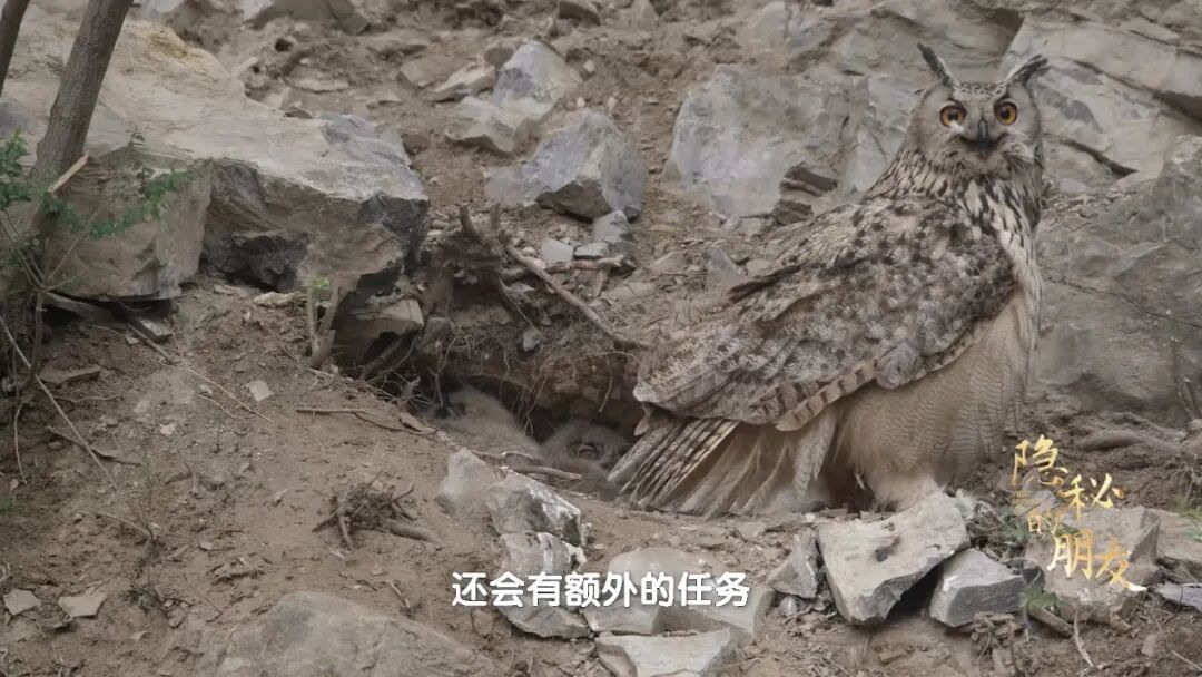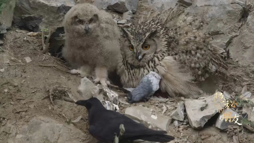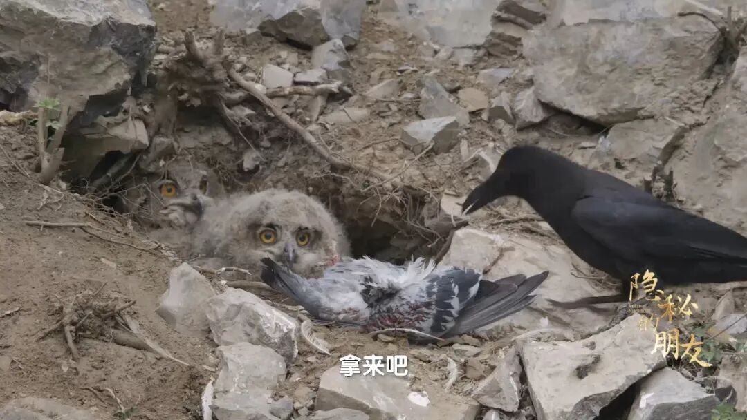 雕鸮妈妈白天守巢养精蓄锐,没想到“厚脸皮”乌鸦趁机上门,专挑小雕鸮没能力反抗时下手,叼走巢边的食物就溜。