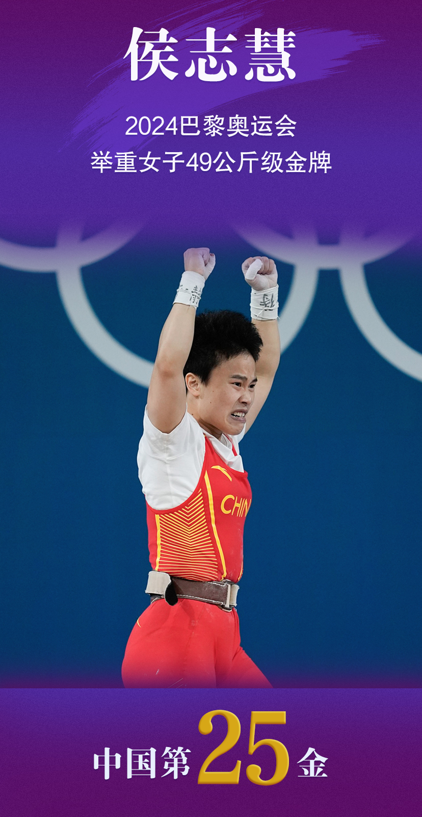 北京时间8月8日,在巴黎奥运会举重女子49公斤级比赛中,中国选手侯志慧以抓举89kg,挺举117kg,总成绩206kg夺得金牌,成功卫冕!这是中国代表团在本届奥运会获得的第25枚金牌。