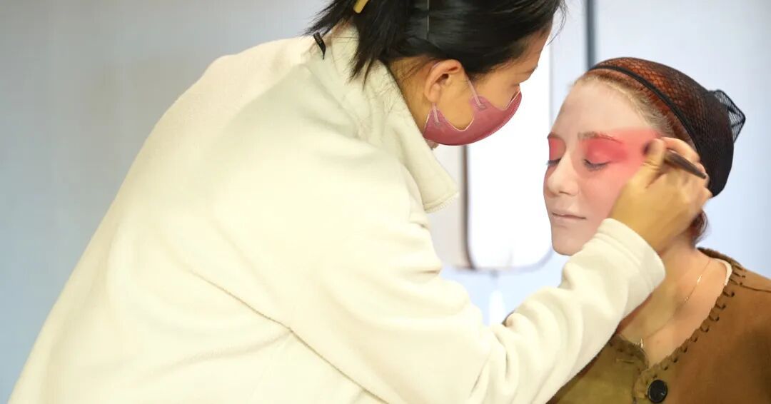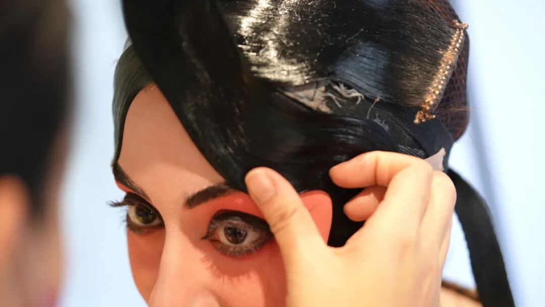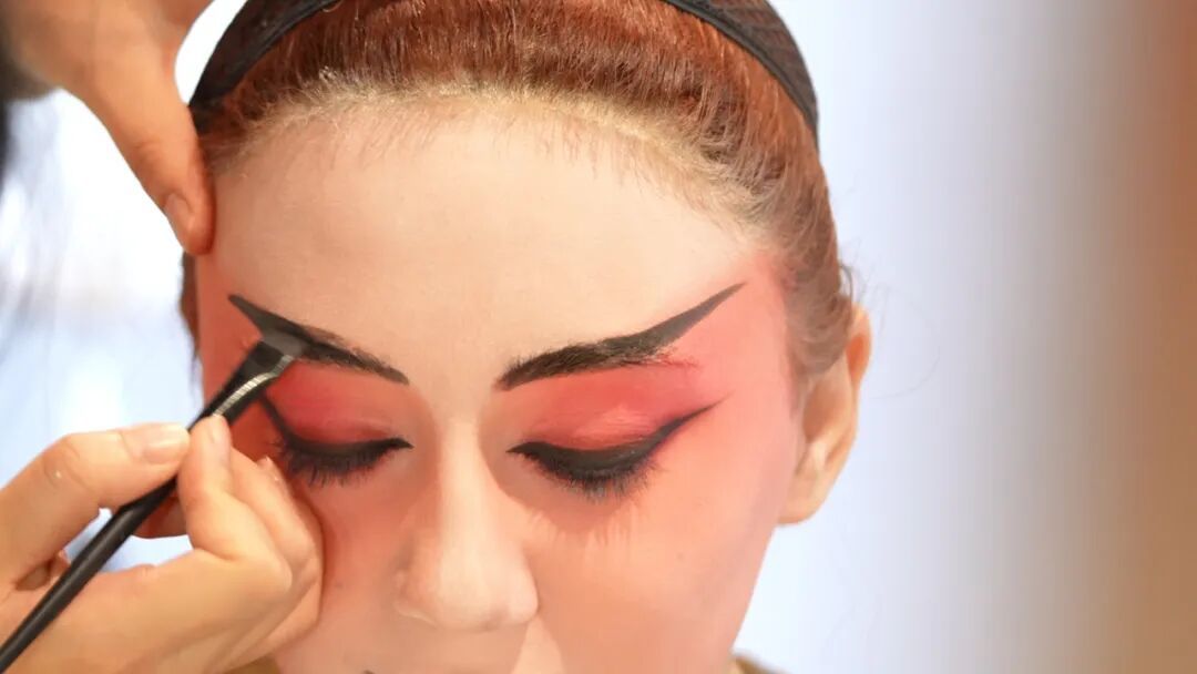 虞姬作为旦角中的“花衫”形象,其妆容以柔美为主。妆容老师用嫩肉色油彩为爱玲上好基底,以胭脂斜向晕染塑造“凤眼”造型,再用松烟墨为她描眉勾眼,爱玲瞬间“变身”为京剧剧目里那个为情而殇的古代女子。