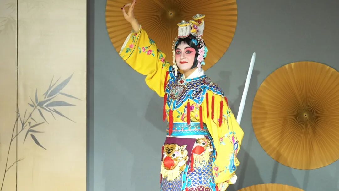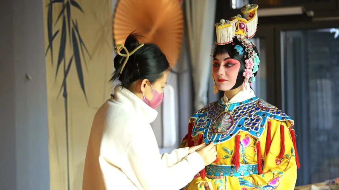 在妆容老师的帮助下,爱玲身着白色“护领”,外搭彩绣凤凰花卉的黄色“古装衣”,再罩上绣满鳞片、缀红丝穗的“鱼鳞甲”,一个英姿飒爽、典雅华贵的虞姬形象便在云肩轻颤、长袖徐拂间立现氍毹。