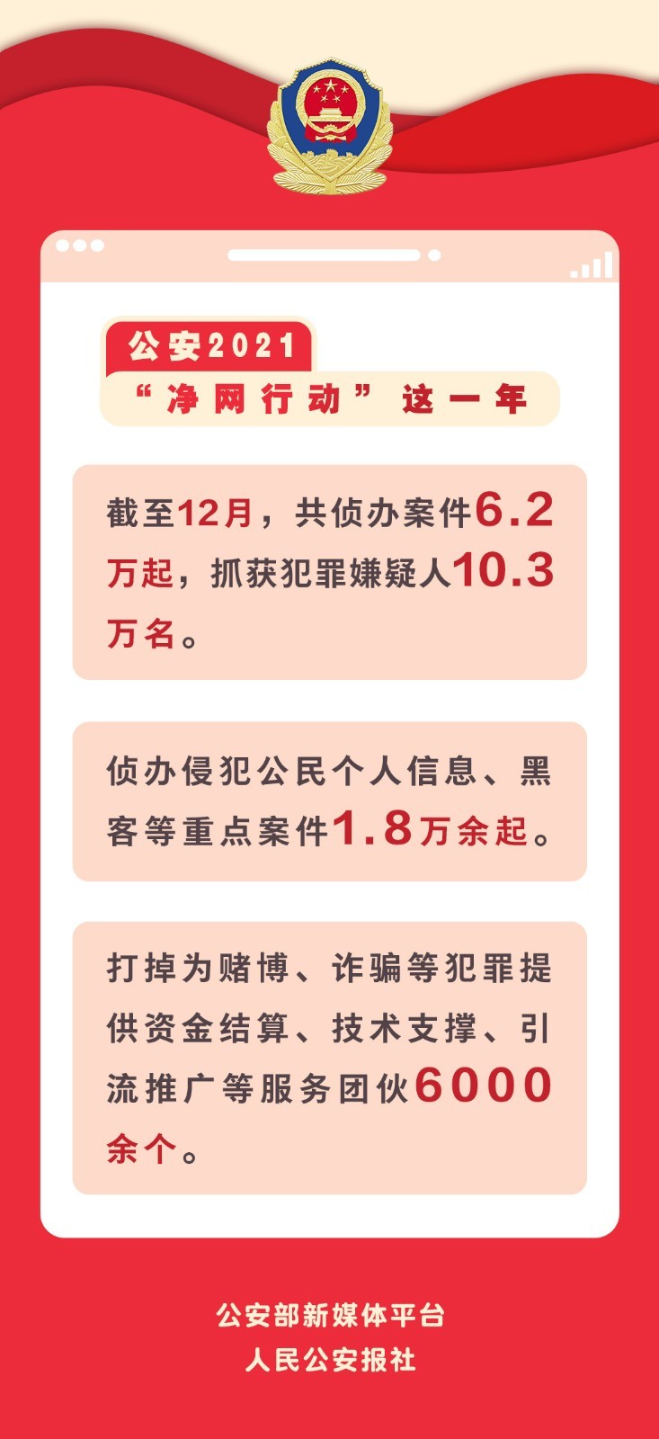 2021年,全国公安机关深入推进“净网2021”专项行动,聚焦人民群众关切的突出网络违法犯罪和网络乱象,持续发起强大攻势,全力打好网络犯罪歼灭战和网络空间生态治理战。