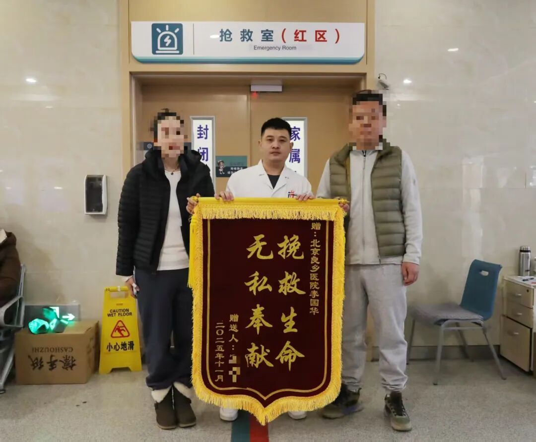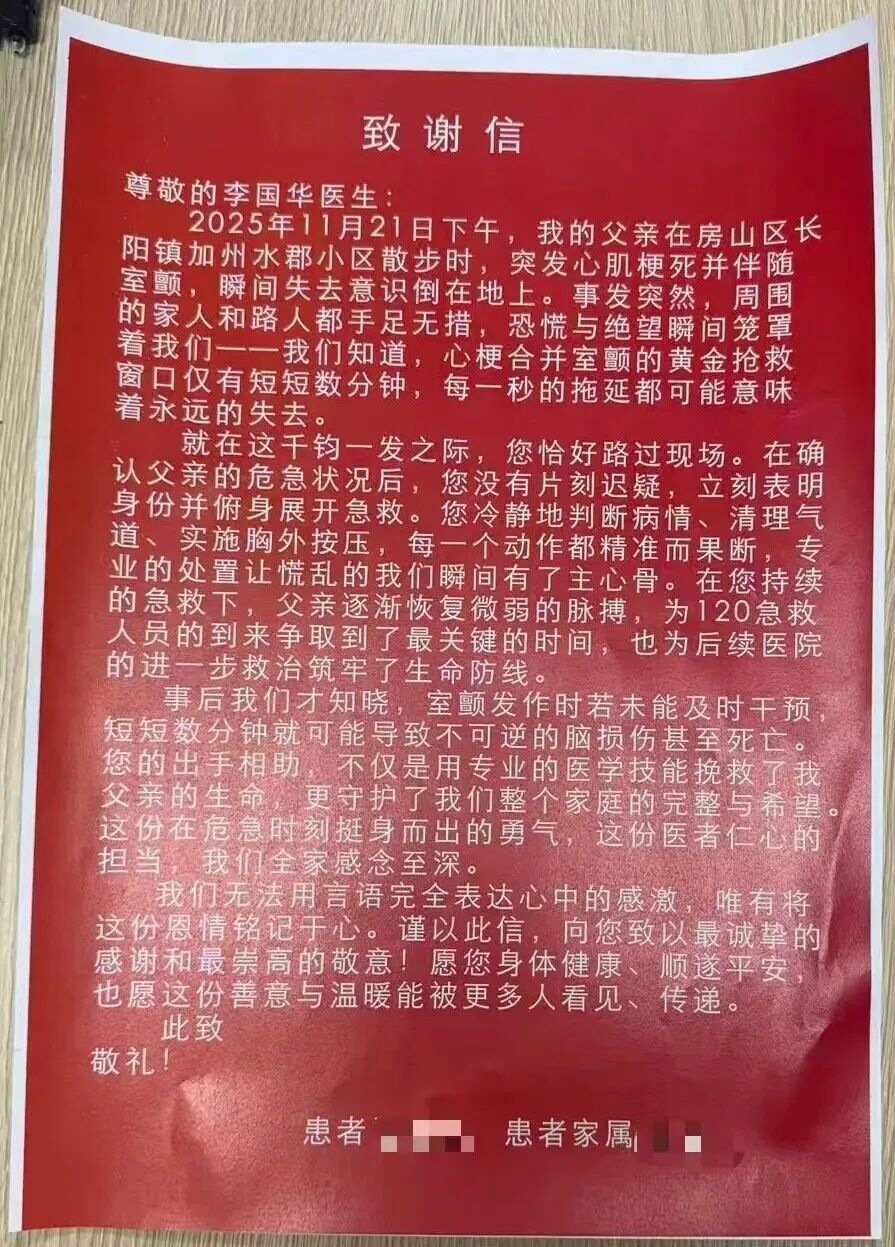 时间一分一秒过去,每一秒都关乎生死。下午4时35分,急救车终于抵达现场。李国华迅速配合医生为老人进行电除颤,并继续实施胸外按压,直至摸到规律脉搏。转运过程中,李国华不顾腿伤,帮忙搬抬患者并护送至医院,成功挽救了老人的生命。正是他果断、专业的现场处置,为后续救治赢得了关键的黄金时间。11月28日,患者家属送来锦旗和感谢信,紧紧握着李国华的手说:“是您及时出手相救,挽救了我父亲的生命”。
