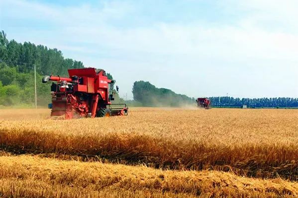 风吹麦浪千层金,机声轰鸣唱丰年。