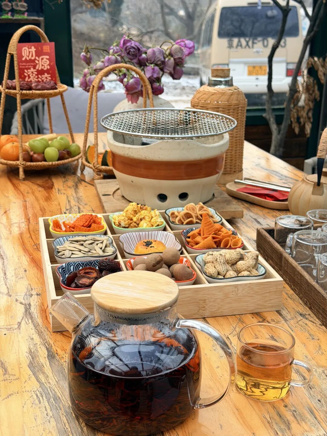 梯田之上打造的“柿柿如意园”成为冬日里的一抹亮色。原生梯田的自然肌理之上,数十株梨树点缀其间,枝头挂满手工制作的蜂蜡花,明艳色彩与雪景相映,营造出暖春般的视觉氛围。游客可参与蜡花手工制作,在体验中寄托美好寓意。步道两侧悬挂的柿子造型灯笼,取意“事事如意”,为寒冷天气增添温馨气氛。