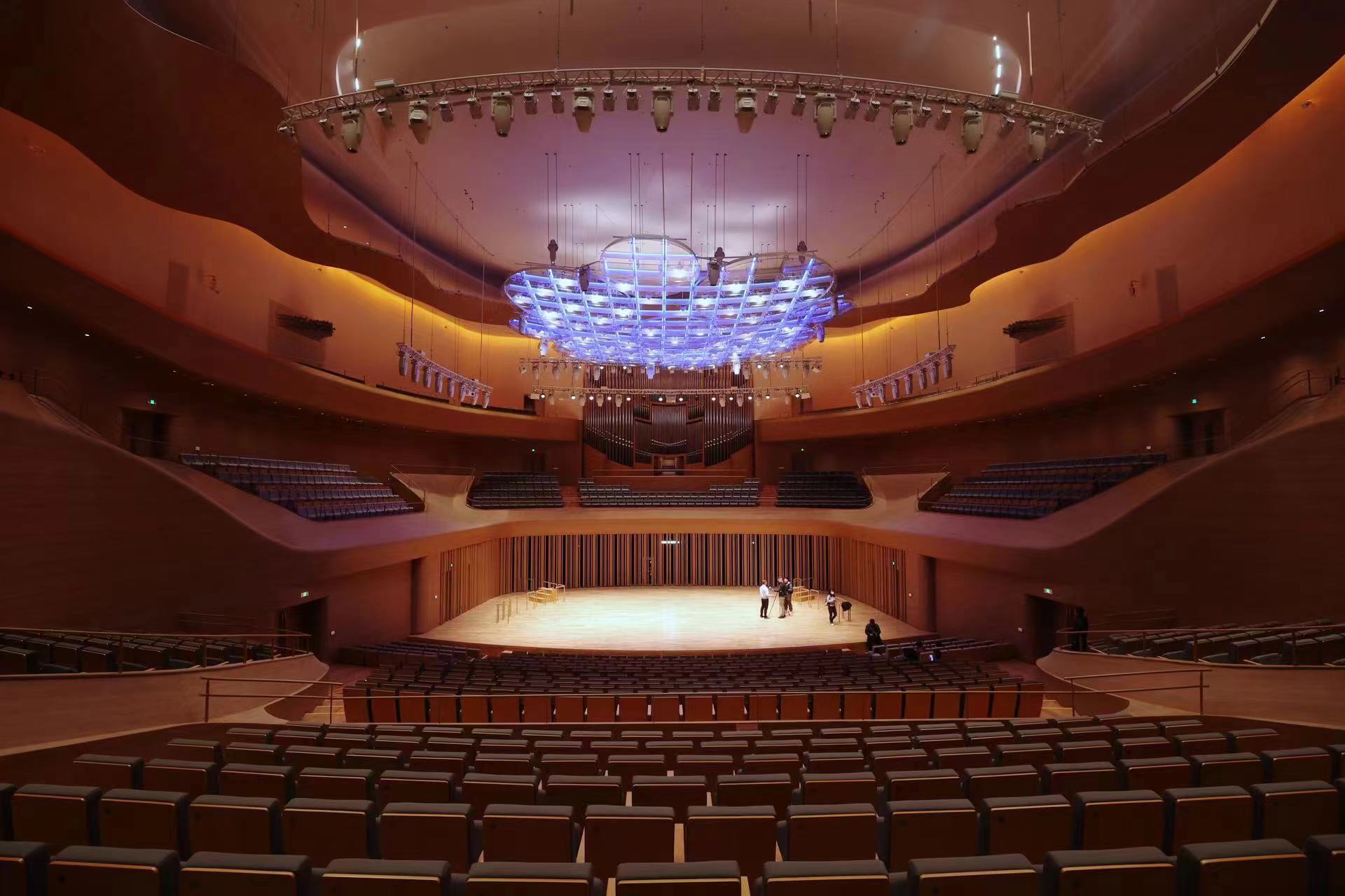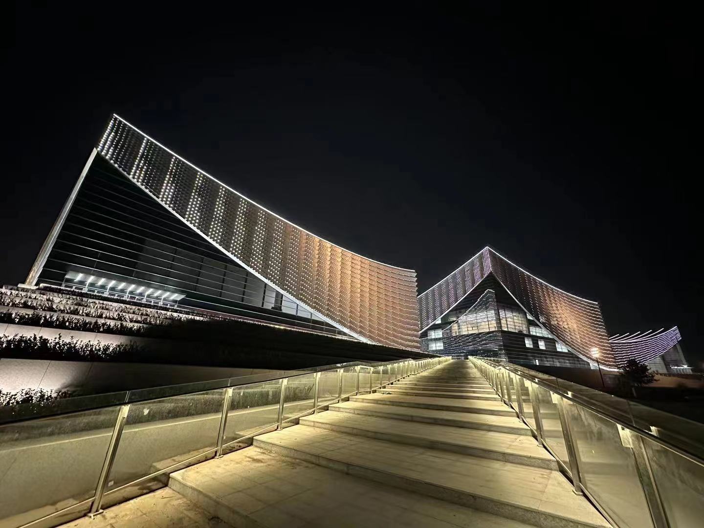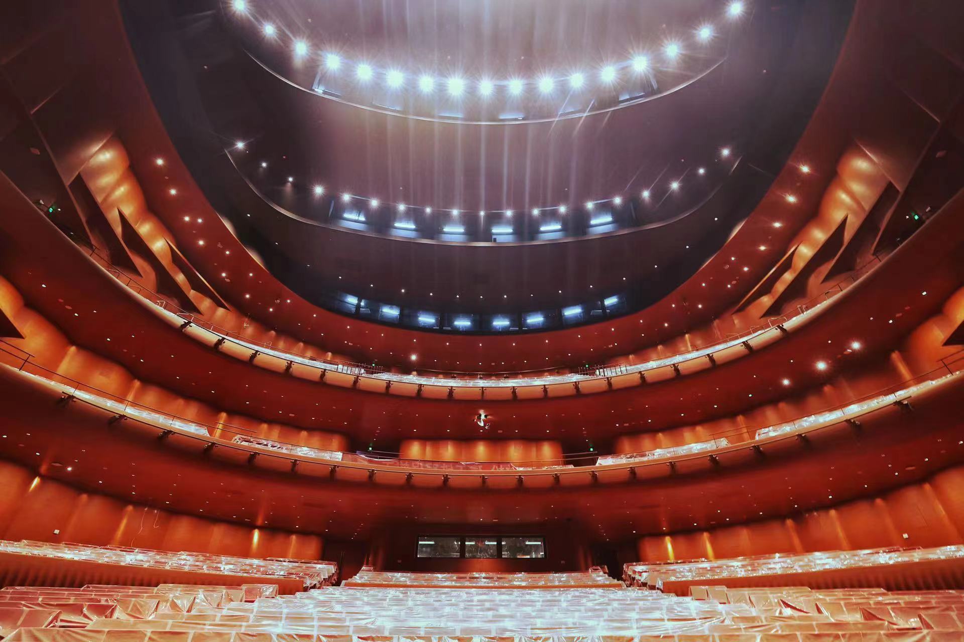 与此同时,夜景照明的设计延续了外立面帷幕拉开的意向,31108个点光源、5500米顶面线槽灯、1200米线条灯,项目团队仅用四个月就完成安装。如今,这些灯光与剧院外幕墙的线条完美重合,组合出一道平滑的折线,极富层次感,仿佛一整块舞台幕布正被缓缓拉起,共同构成夜晚星光熠熠的音乐殿堂。