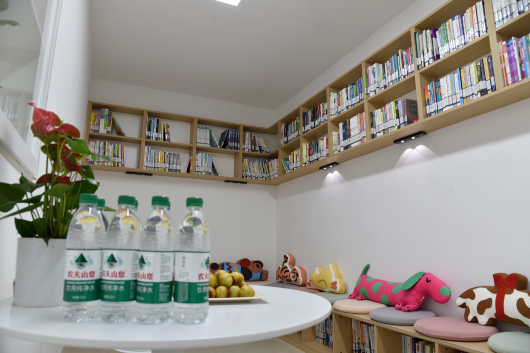 走进社区空间,外屋是社区邻里活动空间和社区直播间,里屋是亲子阅读空间。上千册书籍整齐摆放在书架上,从幼儿绘本、文学名著,到园艺烹饪、健康养生等题材应有尽有,为社区居民提供了丰富的阅读选择。色彩鲜明、形状各异的动物抱枕软装点缀其中,在浓厚书香中平添几分童趣可爱。