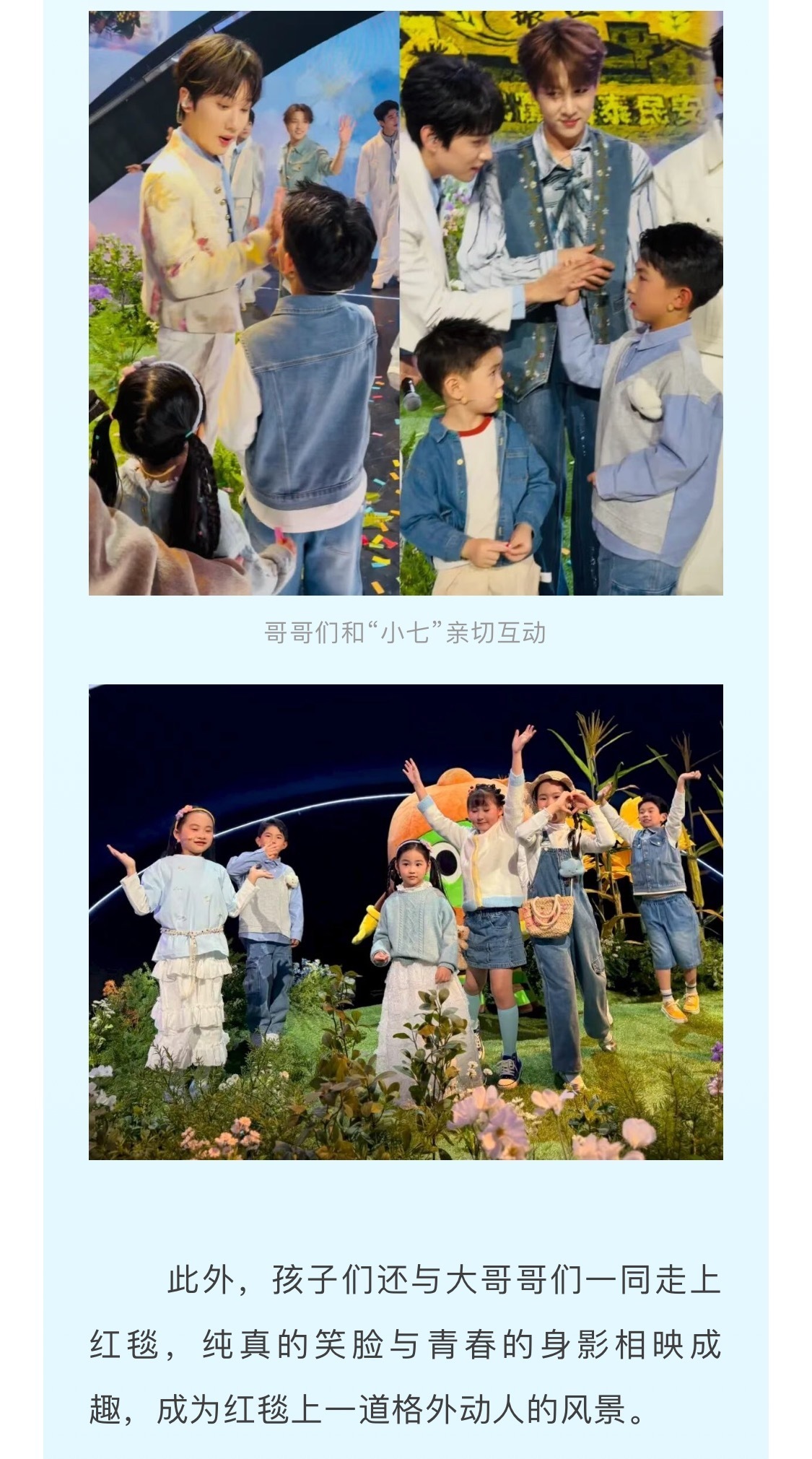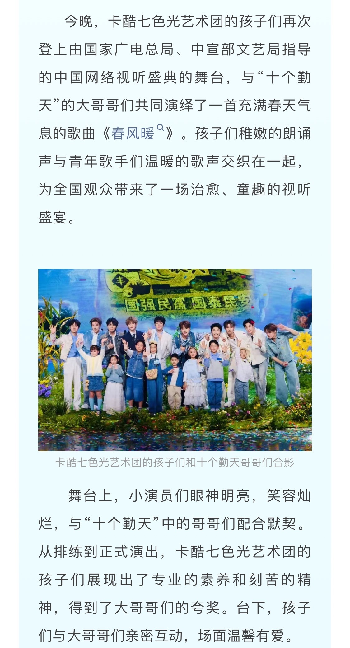 今晚,卡酷七色光艺术团的孩子们再次登上由国家广电总局、中宣部文艺局指导的中国网络视听盛典的舞台,与“十个勤天”的大哥哥们共同演绎了一首充满春天气息的歌曲《春风暖》。孩子们稚嫩的朗诵声与青年歌手们温暖的歌声交织在一起,为全国观众带来了一场治愈、童趣的视听盛宴。