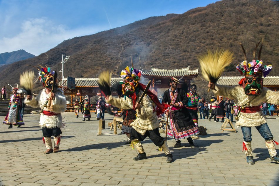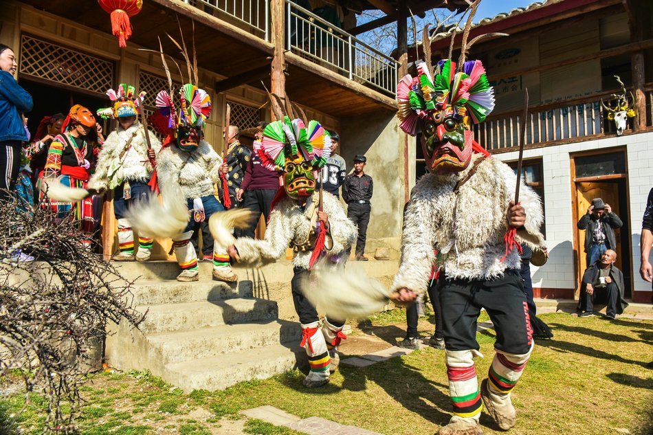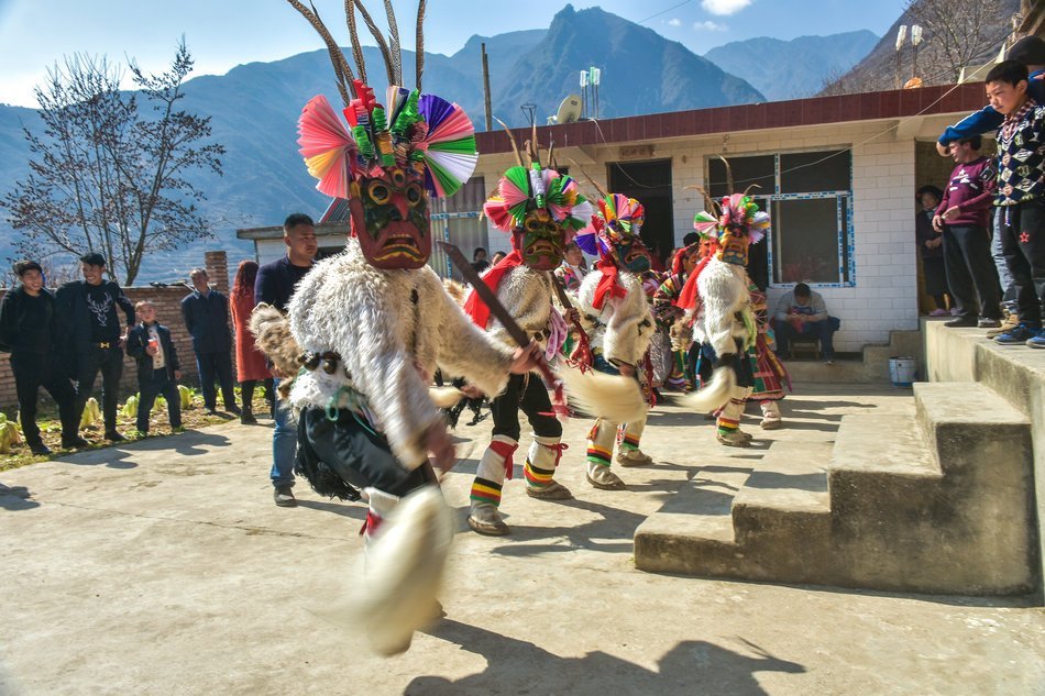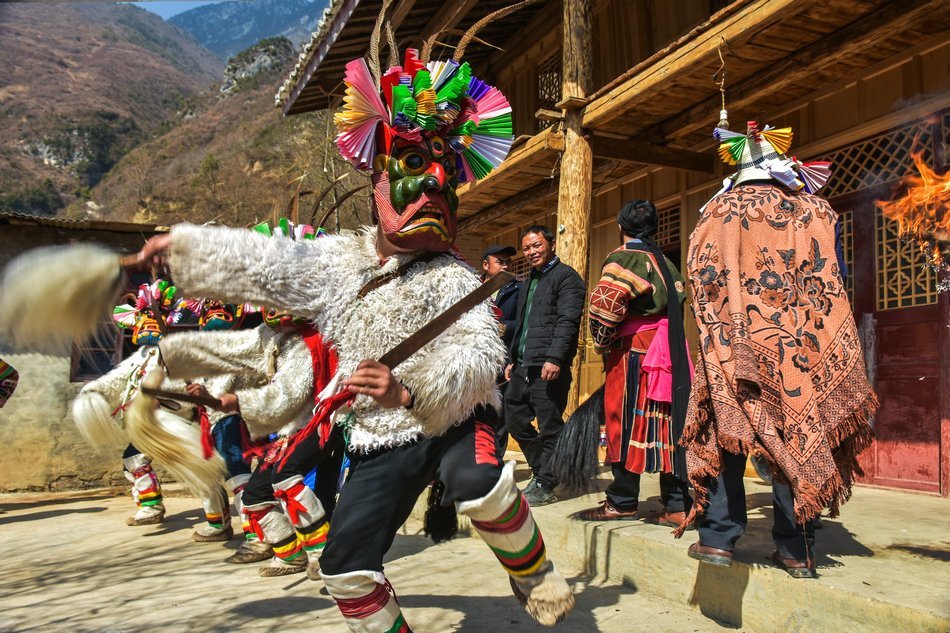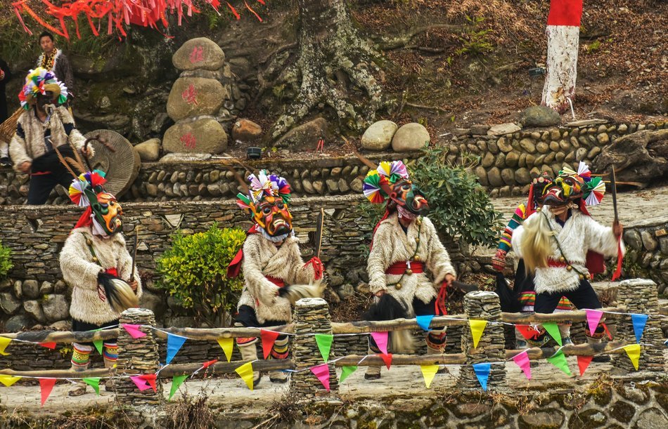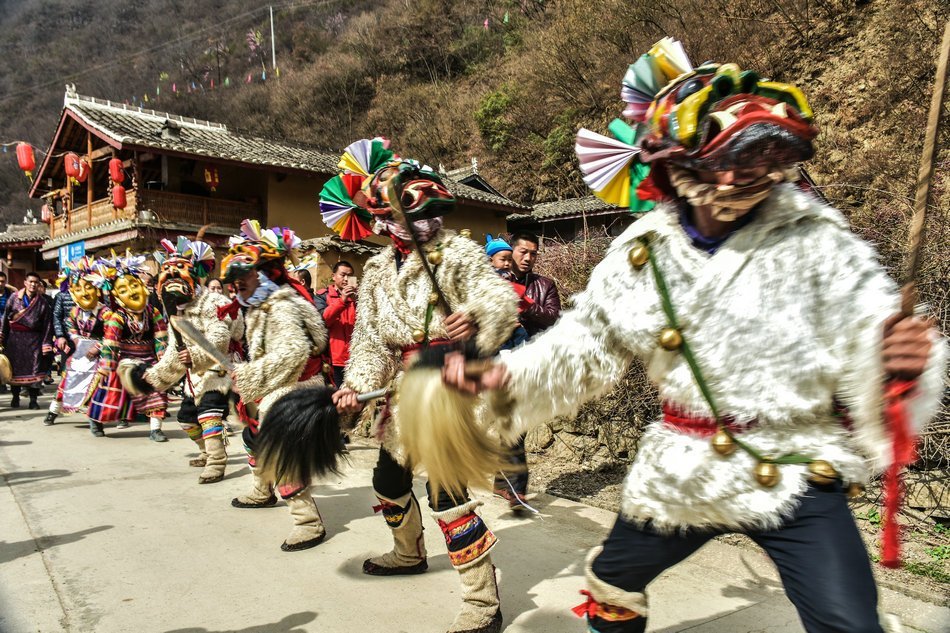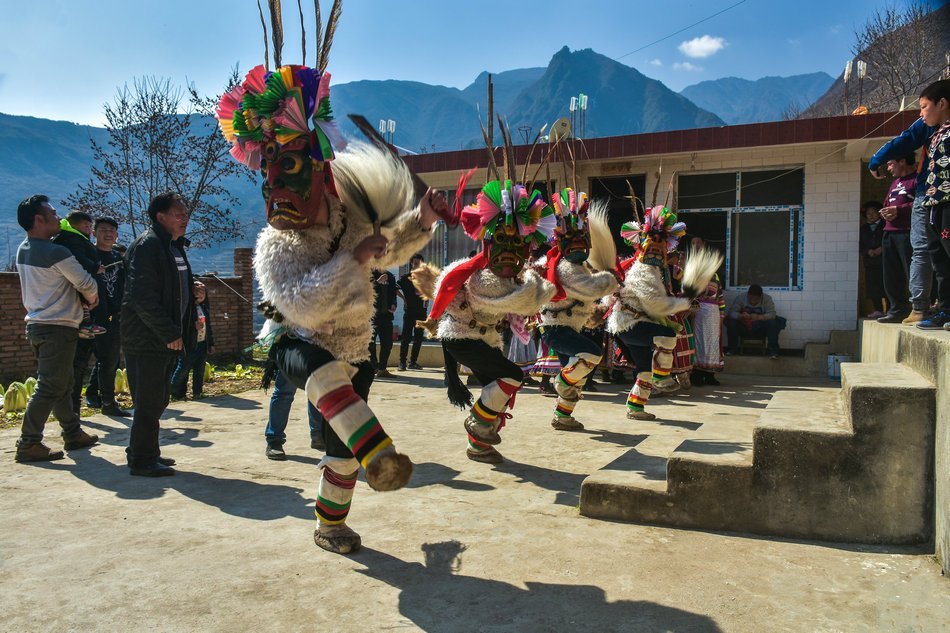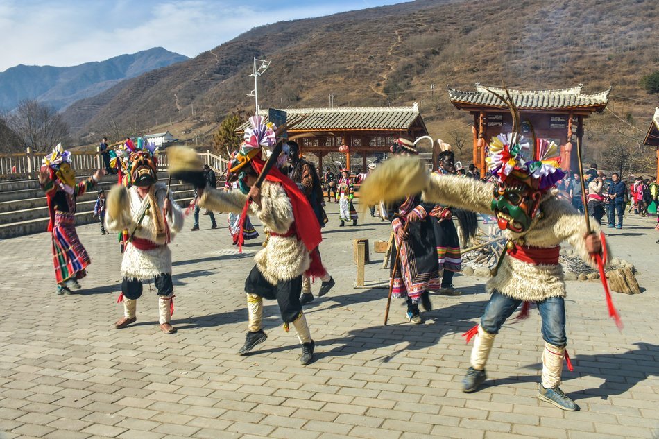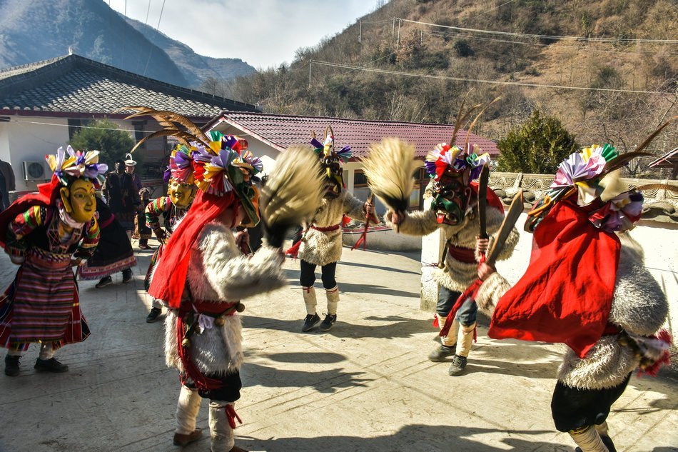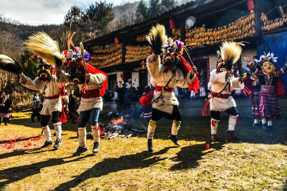 白马藏族居住在山林里,每个寨子后面都是山,山里有很多的动物,白马藏族对动物非常崇拜,他们按照动物的名称对部落进行命名,这是白马藏族一种奇特的文化现象。每当逢年过节,各个部落在戴上他们本部落的标志性面具后,驱邪祈福的歌舞表演就开始了。