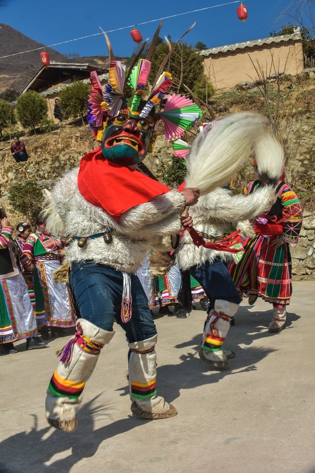 当地人把这种舞蹈称为“十二相舞”,领舞戴号称百兽之王、森林之王的狮头面具,其余舞者所戴动物面具按俗规依次为牛头、虎头、龙头、豹头、蛇头、鸡头、俩小鬼、俩大鬼,是人与动物和谐相处的一种表现形式。该舞因部族不同,所使用的面具在动物种类上略有差异,但大部分相同。它们大多凶猛夸张,其中,小鬼模拟人像,面红,浓眉大眼,象征着法力广大;血盆大口,外加头上一对兽角,显得十分凶悍,可以起到以鬼驱鬼的作用。木雕的禽兽头,表面用红、黄、绿、蓝、黑等色彩绘制,角、嘴、眼都特别突出。