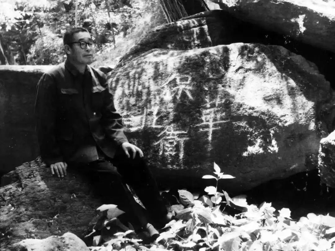 1975年6月,陆平重回樱桃沟,与石刻合影。