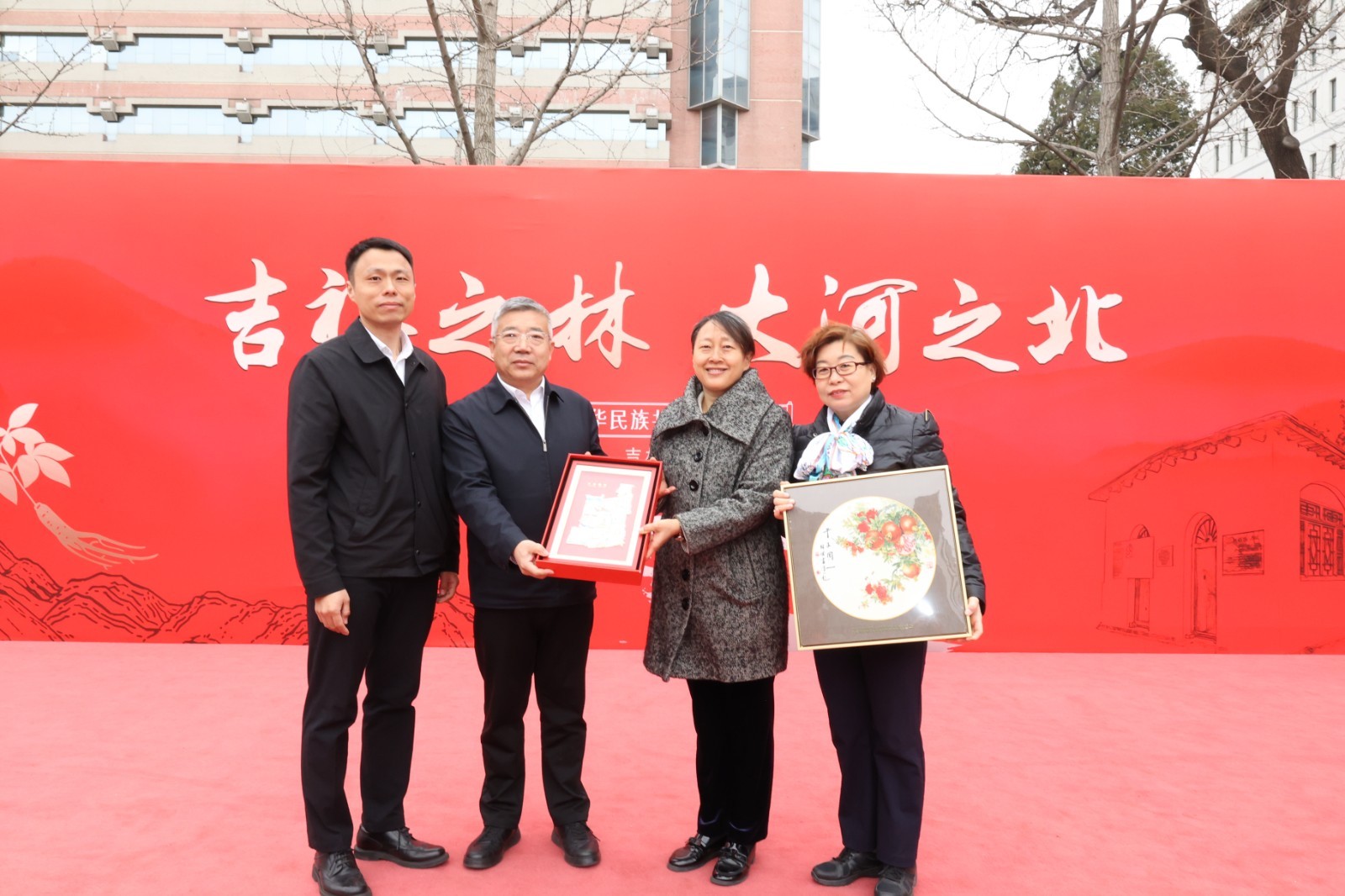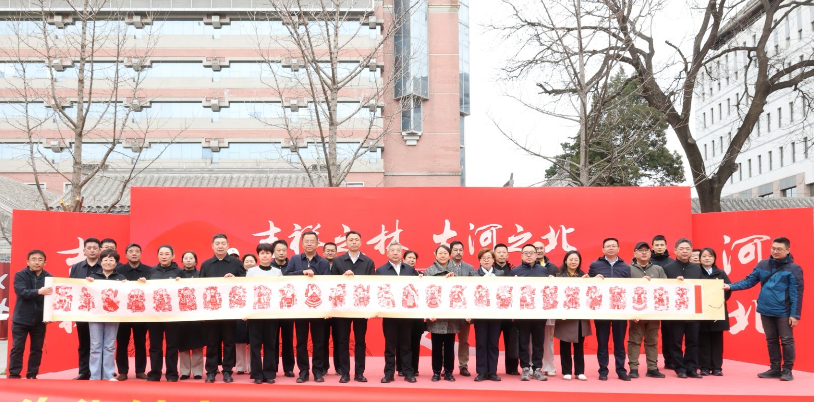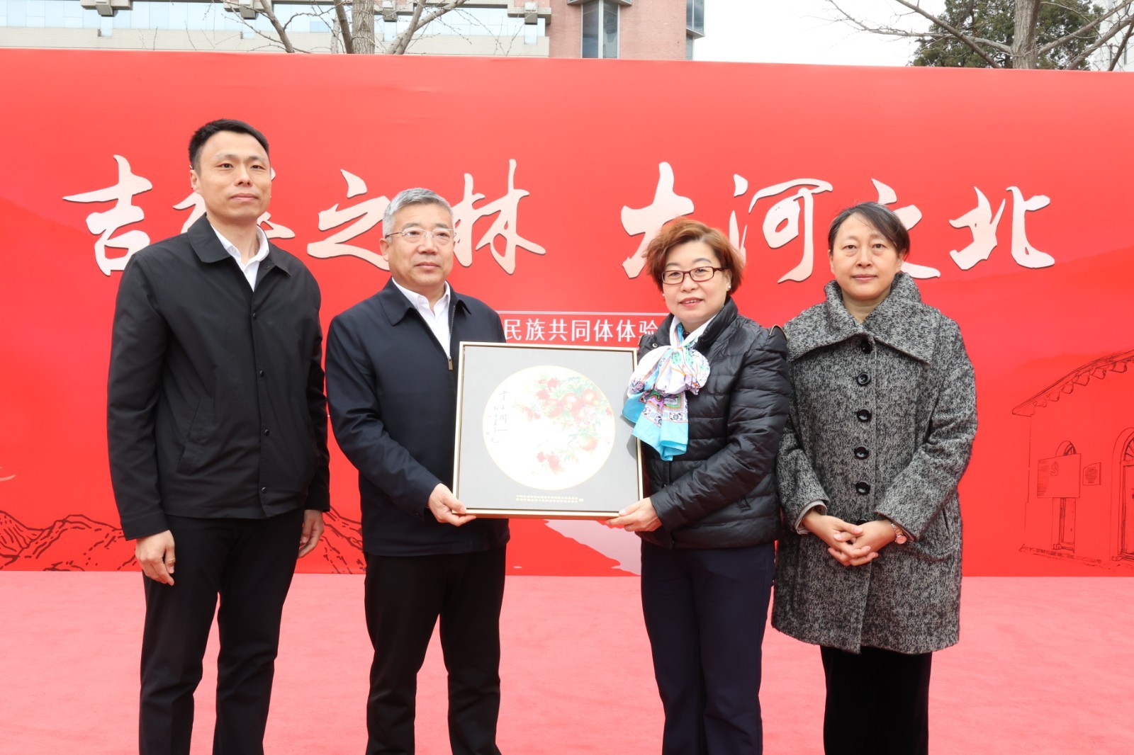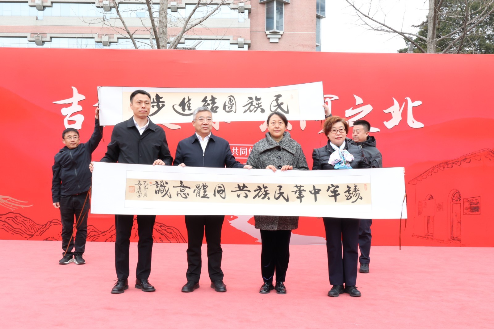 在互赠仪式结束后,全体与会嘉宾共同在象征民族团结的“百和图”和56个民族剪纸画卷前合影。这幅长达10米的剪纸画卷由孟村回族自治县正德小学校长张伟及部分学生耗时两个多月精心制作,每一个民族形象都栩栩如生,生动展现了中华民族多元一体的文化格局。