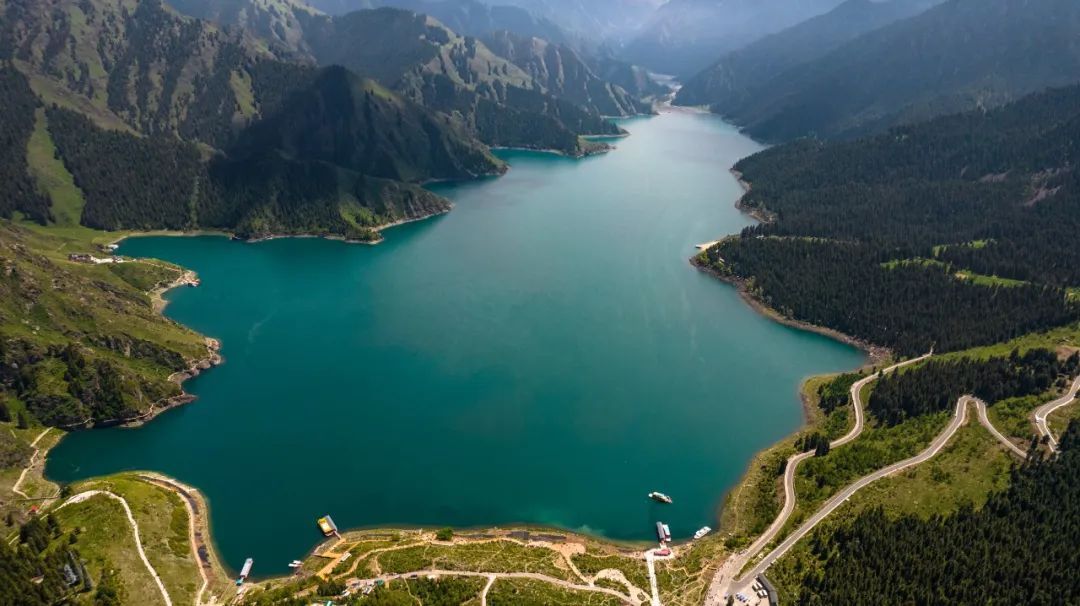天山天池,一泓碧波高悬半山,就像一只玉盏被岩山的巨手高高擎起。湖水深近百米,清澈如玉。远眺博格达峰,雪峰倒映,云杉环拥,感受“一日四季”~