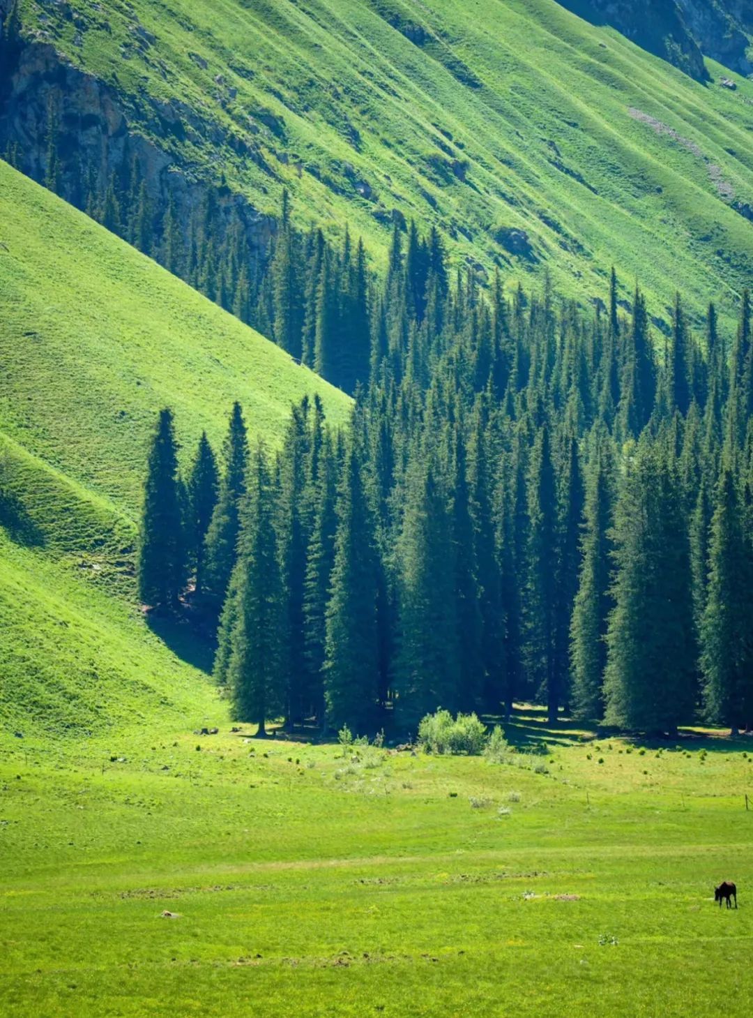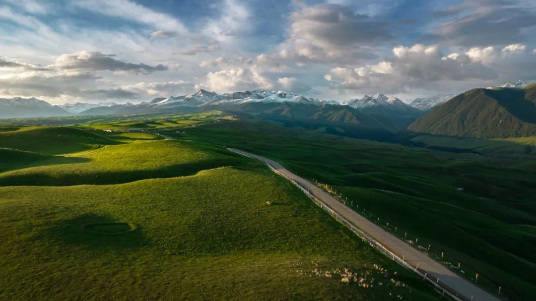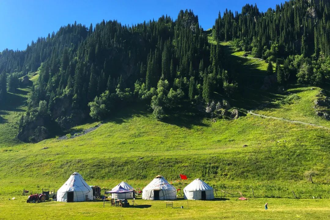 “三山夹两谷”的地貌形态使伊犁成了一座罕见的“湿岛”,温度适宜。此时的伊犁更是一场视觉与感官的盛宴,雪山为幕,草原为席,云杉作伴,野花添香。