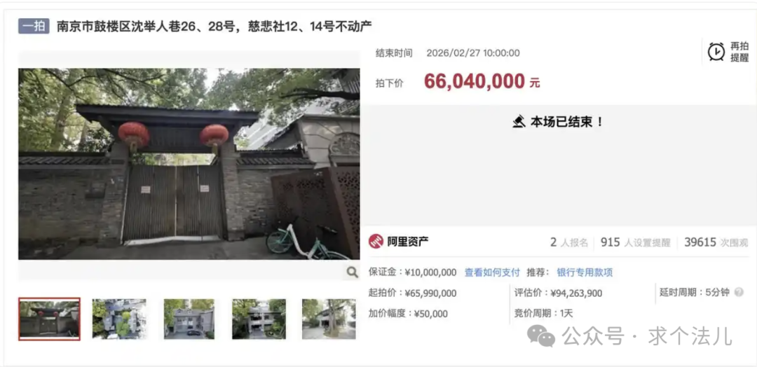 拍卖公告明确,在文物行政部门明确答复前,竞买人不得为外国人,且购房后需至南京市文物行政部门备案。该房产总建筑面积1082.37平方米,评估价9426.39万元,此次拍卖保证金1000万元,增价幅度5万元。