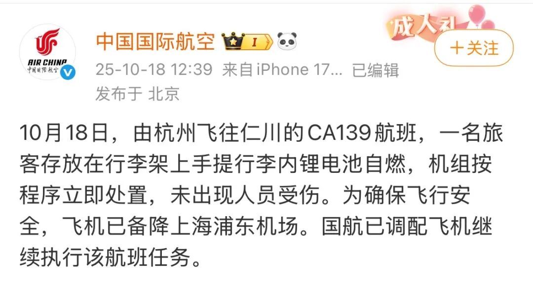 针对行李舱锂电池自燃给消费者带来损失一事,中国国际航空(下称国航)作出补偿。