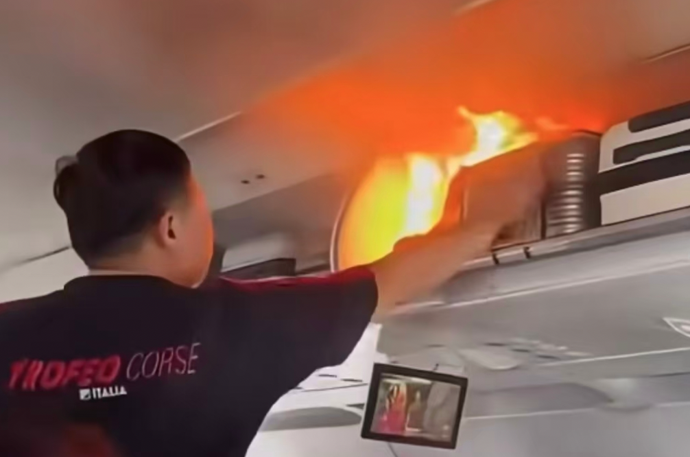 该航班内锂电池自燃时,有明火出现,舱内有黑色烟雾,有人喊道“关掉,关掉”。