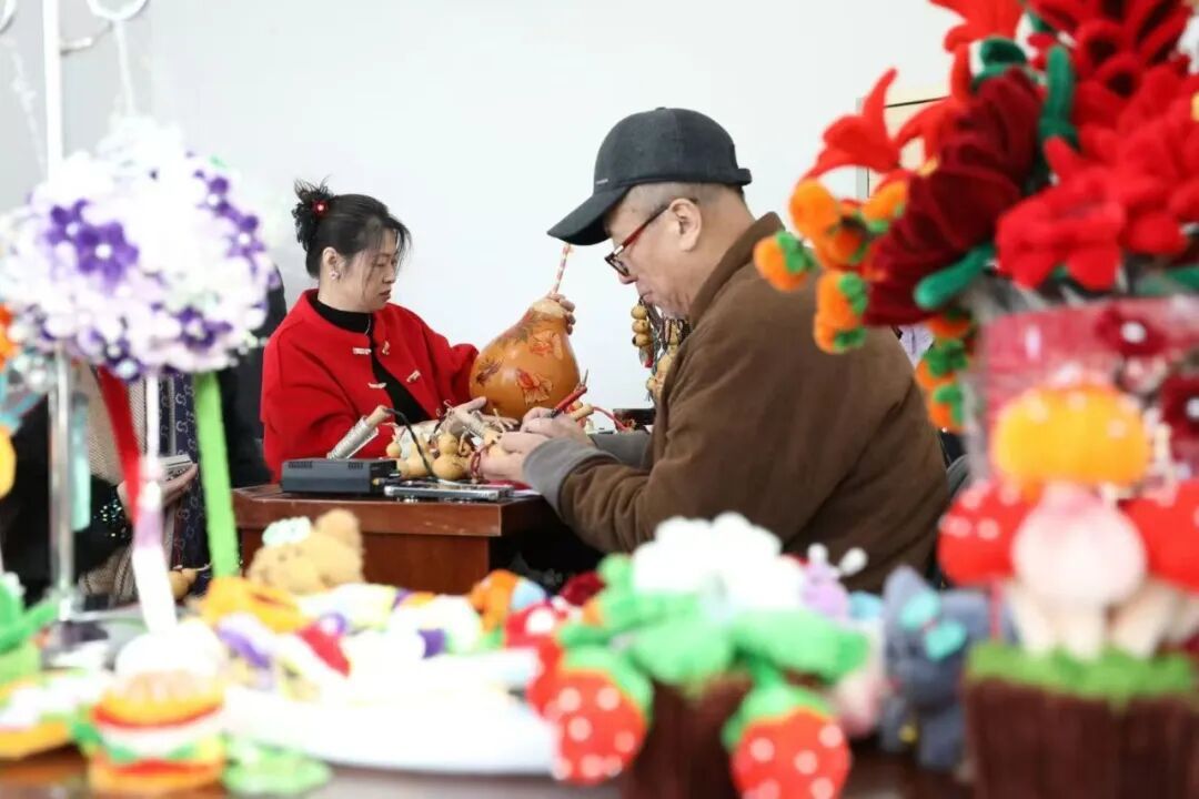 另一侧的手作体验区,非遗技艺、传统手工与新潮村咖巧妙融合,碰撞出别具一格的文旅火花。焦家浸烙葫芦传承人焦宇手持烙笔,在葫芦表面娴熟勾勒出“马到成功”“新年快乐”等吉祥纹样。现场陈列着以“红肖梨、虹鳟鱼、板栗”为主题的精美浸烙葫芦成品,供游客观赏品鉴。同时,活动还设置了浸烙葫芦体验项目,让游客亲手参与制作,近距离感受非遗文化的独特魅力。