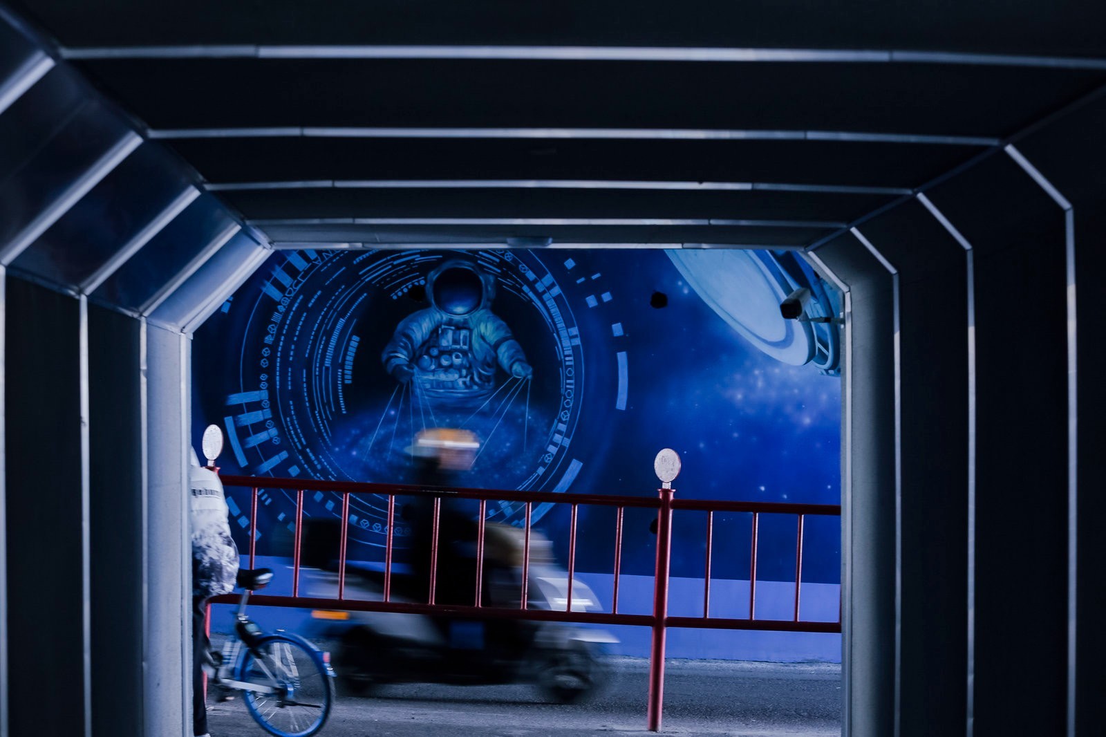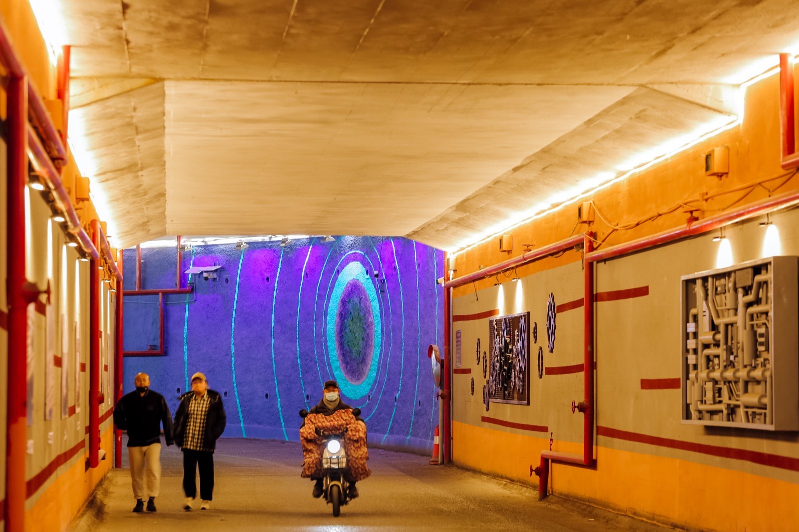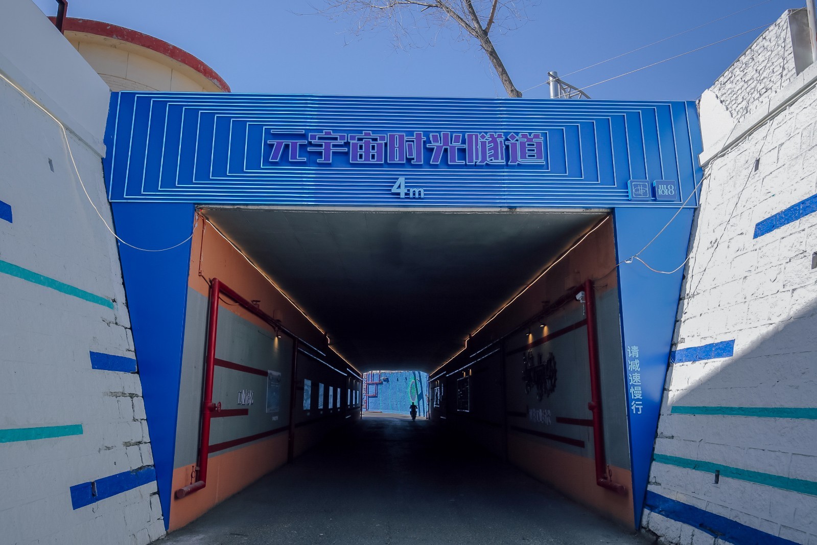 市民走近涵洞口,迎面可见“元宇宙时光隧道”字样,两侧墙壁被粉刷成天蓝色,描绘有宇宙球体、数字代码等图样,并张贴了辖区景观治理效果图等装饰展板,凸显出“穿越时光隧道、探寻宇宙之境”的设计理念。涵洞内分为元宇宙、工业历史、现代街景、发展前景等多个主题展示区,展示了双井的过去、现在和未来。