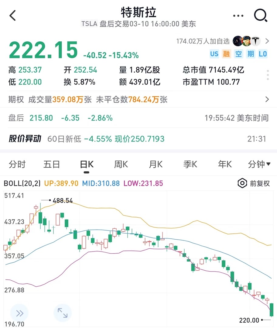 当地时间3月10日,特斯拉股价收盘跌超15%