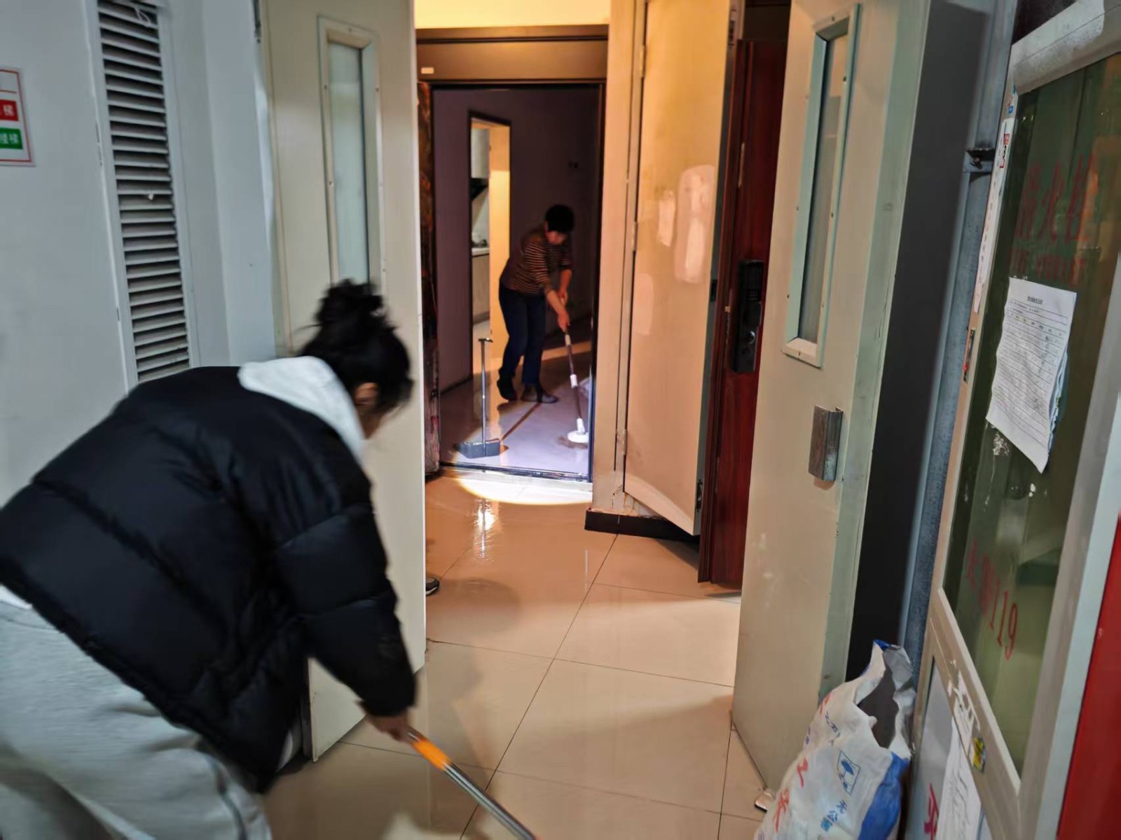 “别慌,我们马上就到!”接到电话,曹成杰与社区党总支书记李剑雄第一时间赶赴现场,迅速核实情况。“大家分工协作,先关阀止水,再全力排水!”面对突发状况,李剑雄和曹成杰沉着指挥,一边安抚焦急的住户,一边协调热力工作人员从源头堵截渗漏,关闭单元暖气总阀。随后,他们卷起袖子,拿起工具,与物业工作人员一同投入到紧张的积水清理中。