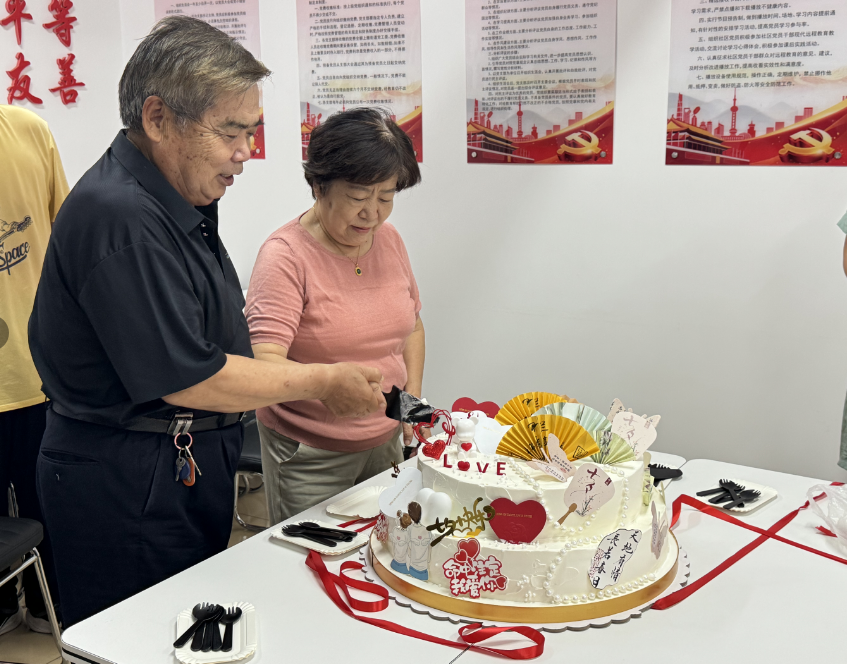 值得一提的是,社区提前为大家准备了蛋糕和鲜花,大家一起切蛋糕,叔叔们拿着鲜花对另一半深情告白,一句句话语朴素且真挚,大家脸上都洋溢着幸福的笑容,