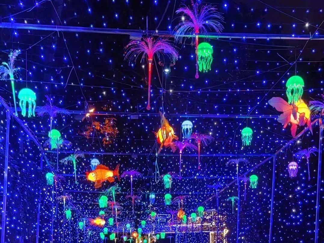 沿着“飞龙在天”长廊步入光影秀,一条由各式各样灯笼组成的巨龙在头顶上方腾飞。走在水波大道上,脚下是光影变幻的水波纹,头顶是五颜六色的水母组成的星空。