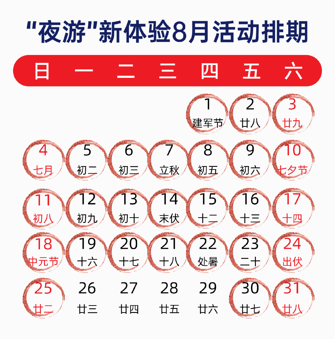 活动时间:2024年8月1-31日(每周二除外)18:00-21:00