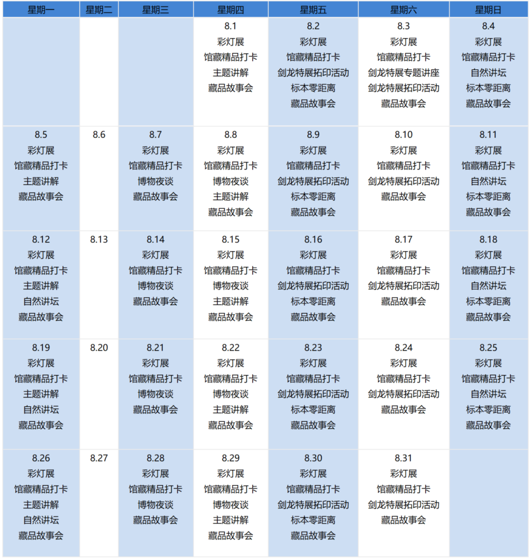 活动包括自然主题非遗彩灯展、“远古剑客——自贡侏罗纪恐龙”特展、“夜宿活动”“藏品故事会”“锺健讲堂”及“标本零距离”等11种特色项目。