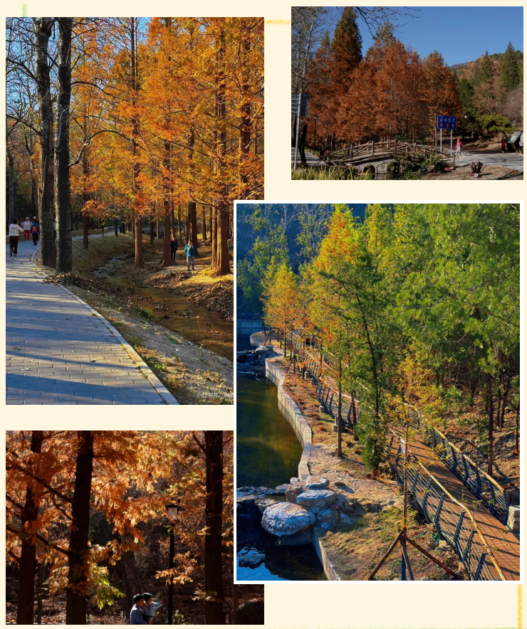 白水寺森林公园内有寺庙、溪流、水杉林以及大片绿植,是亲近自然的好去处。公园内既有木栈道可以溜达,也有登山步道可以爬山,适合所有人群。林中水杉叶色由绿变黄,甚至红色,然后逐渐掉落,树与水交相辉映,风景如诗如画,令人沉醉。