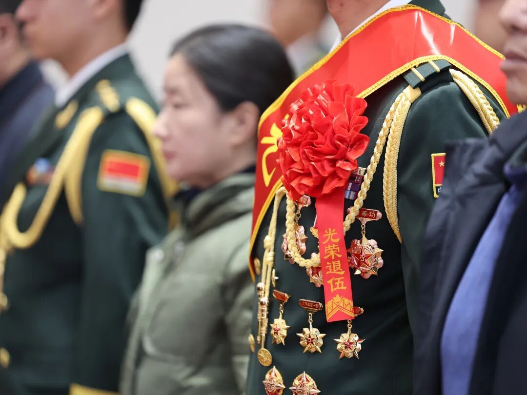 退役军官胸戴大红花