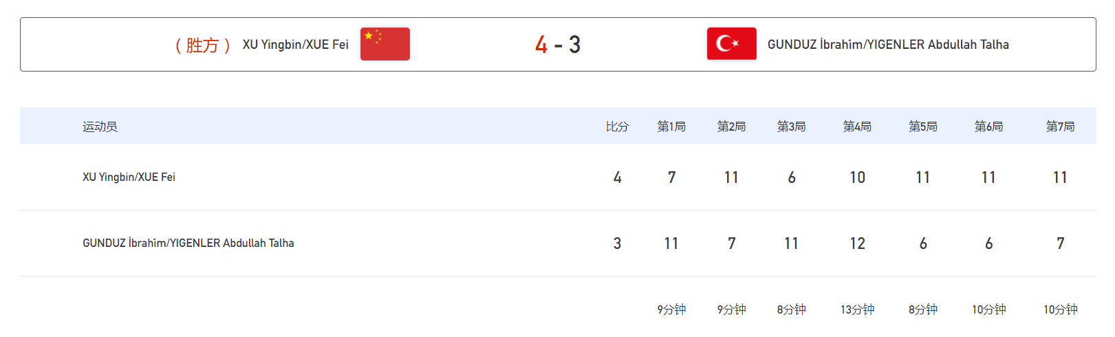 相比于女双,稍后出场的两队男双组合则是与对手展开激烈鏖战。1号台的徐英彬/薛飞,他们的对手是土耳其组合冈德兹/伊根莱尔。徐英彬/薛飞大比分1比2落后、第4局更是4比10落后的情况下,两位中国小伙子一度追至10比10。可惜随后的两分二人未能乘胜追击,最终是10比12输掉了这一局,大比分1比3落后,形势非常危急。