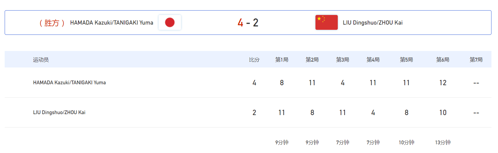 另外一边的2号台,刘丁硕/周凯也非常不顺利,对阵日本组合滨田一辉/谷垣佑真,他们一直处于追赶者的角色,一度是大比分2比3落后对手。关键的第6局,双方相持不下一直来到了10比10。关键分上,中国组合没能顶住,最终是10比12败下阵来。最终,刘丁硕周凯大比分2比4不敌滨田一辉/谷垣佑真,无缘决赛。