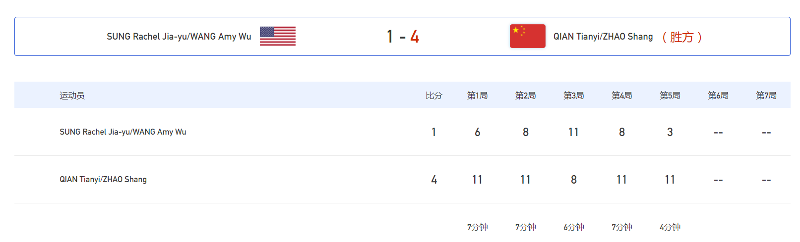 同一时间在2号台出场的钱天一/赵尚组合稍微遇到了一点困难,他们是以大比分4比1战胜美国组合宋家瑜/王艾米,晋级决赛。