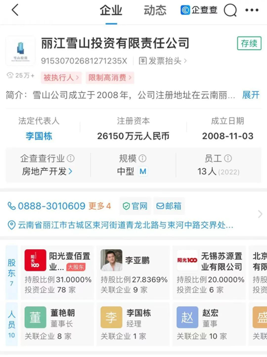 丽江雪山投资有限责任公司法定代表人为李国栋,但最终受益人为李亚鹏。
