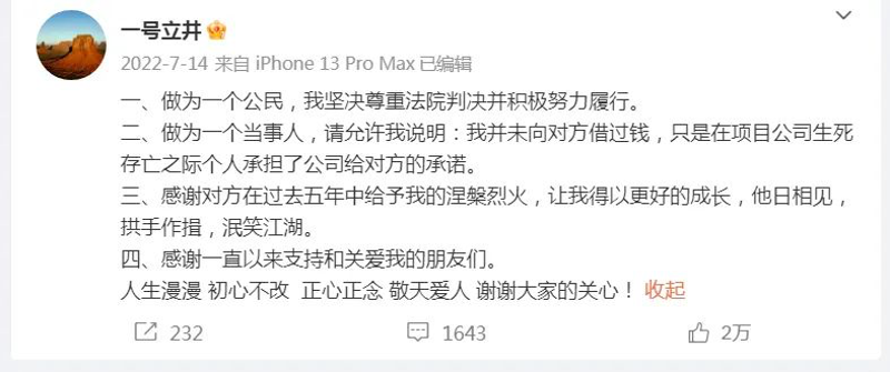 2022年7月14日晚,李亚鹏在个人微博回应表示,“做为一个公民,我坚决尊重法院判决并积极努力履行。”他表示,“我并未向对方借过钱,只是在项目公司生死存亡之际个人承担了公司给对方的承诺。”