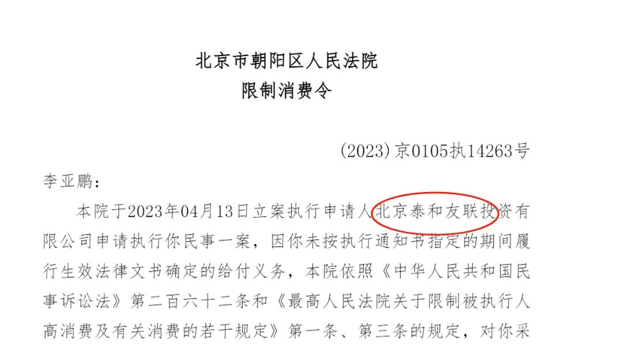 中国执行信息公开网显示,10月17日,因未按时履行生效法律文书确定的给付义务,李亚鹏及哥哥李亚炜被限制高消费,申请人为北京泰和友联投资有限公司(下称泰和友联公司),执行法院为北京市朝阳区人民法院。
