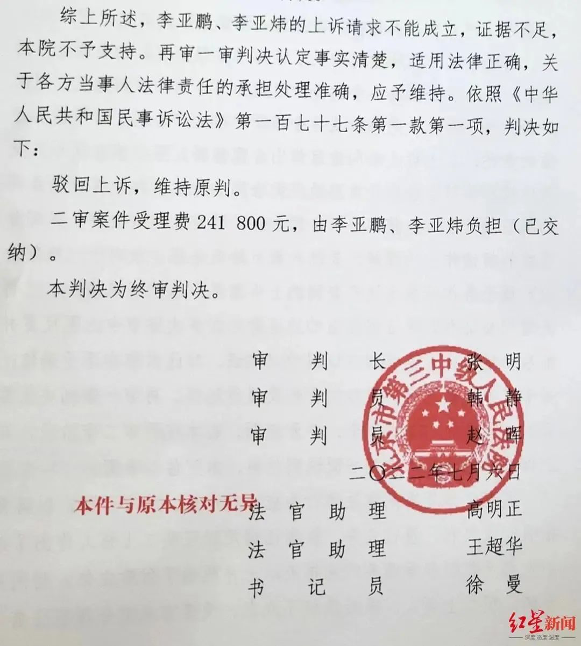 据红星新闻此前报道,2022年7月6日,北京市第三中级人民法院对李亚鹏“欠债4000万元”一案做出终审判决,法院判决,驳回李亚鹏及其哥哥李亚炜的上诉,维持原判。
