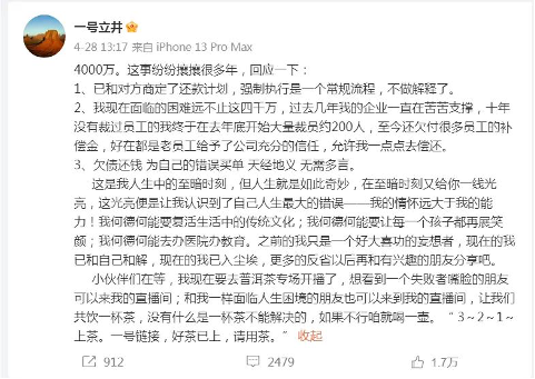 李亚鹏还表示,自己面临的困难远不止这4000万元,他承认自己的“情怀远大于能力”,但他也表示,“欠债还钱,为自己的错误买单,天经地义,无需多言。”